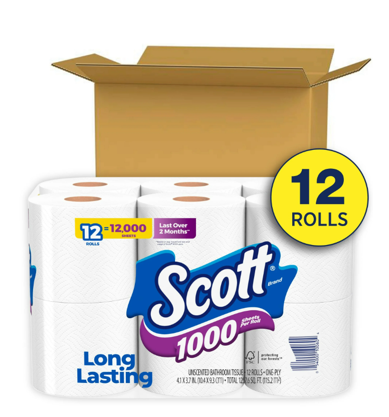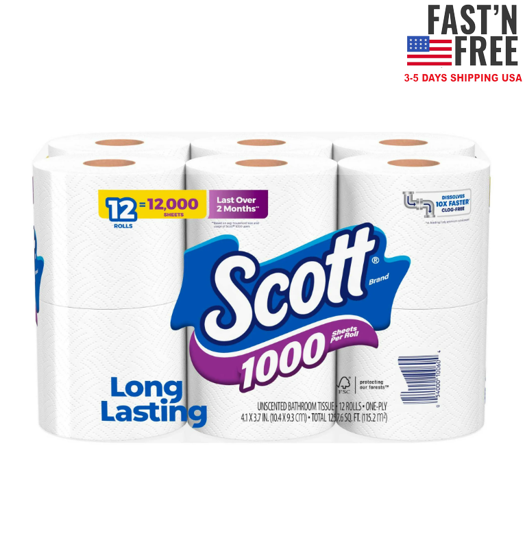 Scott 1000 Toilet Paper, 12 Rolls, 1,000 Sheets per Roll US Warehouse - FREE & FAST Shipping SALE!!! DESCRIPTION: Scott 1000 toilet paper helps you spend time on what matters most. Each roll of Scott 1000 bath tissue has 1000 sheets, resulting in fewer roll changes* and making it last 2x longer**, so you'll always have enough for you and your family. Plus, Scott 1000 1-ply toilet paper is made with clog-free technology, making it perfect for low-flow toilets. Our toilet tissue dissolves 10x faster** and is 100% septic-safe. Get more with Scott and order Scott 1000 toilet paper in bulk online! (*among national brands) (**vs national brand soft & strong mega roll) 12 rolls of Scott 1000 Toilet Paper, 1-ply, 1000 sheets per roll Long Lasting Rolls: Each toilet paper roll comes with 1000 sheets per roll for fewer roll changes* (*among national brands) Reliable Performance: Our bath tissue lasts 2x longer and dissolves 10x faster*** (***vs national brand soft & strong mega roll) Clog-Free Technology: Scott 1-ply toilet paper is made with clog-free technology, so it is 100% septic-safe and ideal for low-flow toilets Scott packaging and product may vary from images shown of rolls 12 Toilet paper roll size 1000 Sheet Toilet paper thickness 1 Ply Sheets 12000 Scent Unscented Recycled mat 15% Count 1000 Count 12 Rolls ($.081 per 100 Sheets) Features Clog-Free, Dissolving, Septic Safe Brand Scott Material Wood pulp, Water, Conditioners, and Adhesive Recycled material type post-consumer recycled fiber Percentage of postconsumer content 15 Perforated Y Color White SHIPPING: It takes about 3- 6 business days for delivery for USA order , Business days exclude weekends and holidays We do not ship to warehouse addresses RETURN & EXCHANGE: We stand behind the quality of our products and guarantee our workmanship 100%. Any defects or errors on our part will result in a replacement at no charge. We typically do not accept returns due to user error such as incorrect selection of sizes, designs, colors, etc. We just can accept return for damage or bad printing result, wrong size and design from us Therefore, if there are any issues about the item, please do not leave negative/neutral feedback, please contact us and give us an opportunity to resolve the problem first Before opening a return case on eBay, please contact us with the reason for return and send us proof like the picture, it will be easier for us to handle your problem. If you were pleased with this transaction, it is really appreciated to give us positive feedback, thanks! CONTACT US: If you have any question, feel free to contact us. We endeavor to respond within 24 hours. If you are not satisfied, please contact us immediately. We will do our best to resolve your concern FEEDBACK: If you are happy with your purchase, PLEASE take a moment to leave Positive feedback for us. We really appreciate that. If you are not happy with the purchase, PLEASE contact us to resolve the problem. We are always here to give you the best solutions. THANK YOU SO MUCH GOD BLESS YOU AND FAMILY!!!