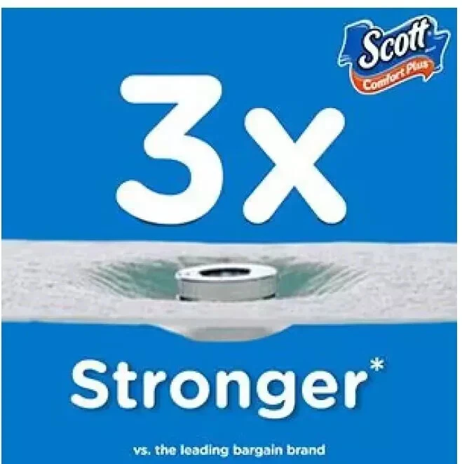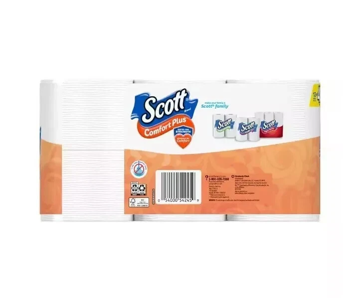 Scott Toilet Paper Mega Roll Comfort Plus, 425 Sheets Per Roll 12 Rolls Per Pack Scott ComfortPlus toilet paper is the only 1-layer bath tissue that offers everyday comfort plus a little extra. 3X stronger than the leading bargain brand, Scott ComfortPlus is sewer-safe and septic-safe and designed with strength and comfort in mind. Scott ComfortPlus toilet paper combines just the right amount of softness and strength by providing thick and plush sheets, for a trusted, comforting clean. Scott bath tissue is sustainably sourced from responsibly managed forests. Features and further details 12 mega toilet paper rolls = 48 regular rolls 3X stronger 1-layer toilet paper vs the leading value brand Thick and plush sheets provide a trusted, comforting clear Sewer-safe and septic-safe bathroom tissue Scott bath tissue is sustainably sourced from responsibly managed forests