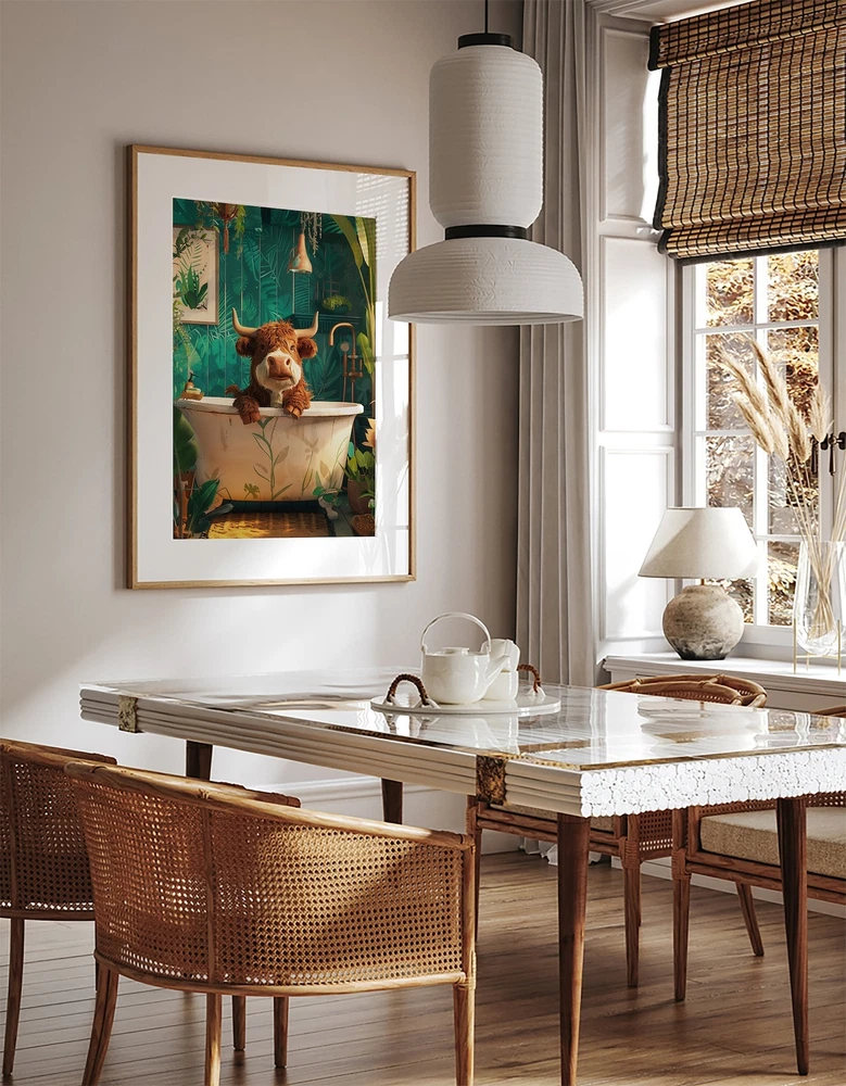 Scottish Bull In A Tub Bathroom Wall Art Botanical Animal Print Maximalist Animal In Bath Art Tropical Bathroom Jungle Bathroom Decor Material: Premium luster photo paper Print type: Inkjet printing One side printed + The finish provides the highest possible resolution and color saturation + Lasts up to 200 years in color and 400 years in black-and-white + Printed on high-quality resin-coated photo base paper medium + Posters can be hung with double-sided tape, tacks, or framed + Hand washing with a gentle cry cloth is recommended for extended durability I will hand select the best choice of paper for your chosen design to ensure top quality results for a beautiful, bright and luxurious print. All prints are sealed in cellophane slips for protection during transportation, and are shipped in a protective cardboard envelope.