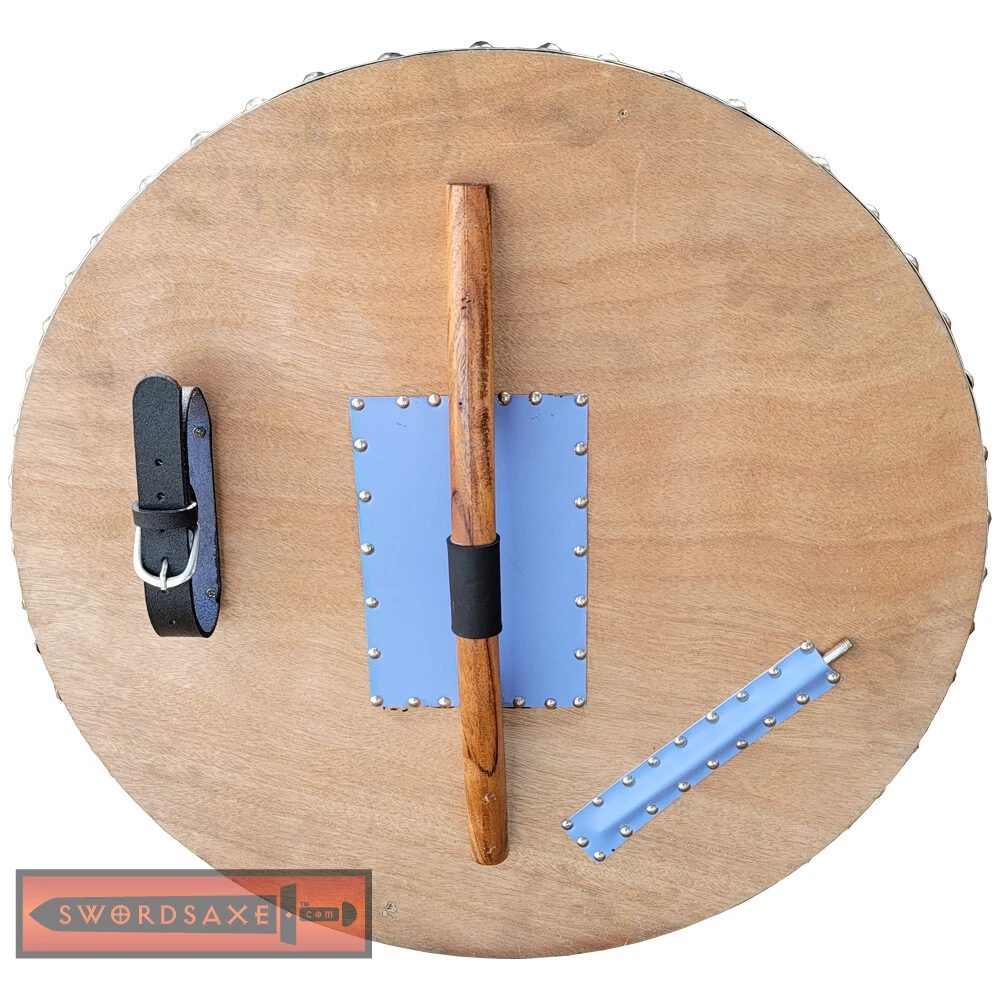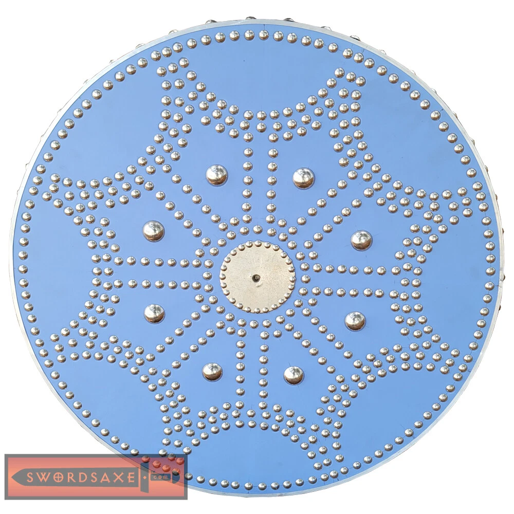This is an authentic Scottish Targe Shield reproduction made by hand and is not a mass-produced item. Due to the nature of making it with original hand working tools, slight variations may exist from the pictures. Specifications Almost 500 Rivets adorn the front, sides and back of the Shield Removable Spike with Leather Storage Full Leather Covered Front Face Overall Diameter: 23 Inches Base Material: Hardwood, Hand Cut, Fitted Surface Material: Chromed Aluminum Trim, Steel Rivets Overall Thickness: 19mm w/o Handle Shield Weight: 10 to 11 Pounds Features: Leather Arm Strap and Wooden Grip Features: Leather Arm Rest, and Spike Pocket Entirely Handmade Product