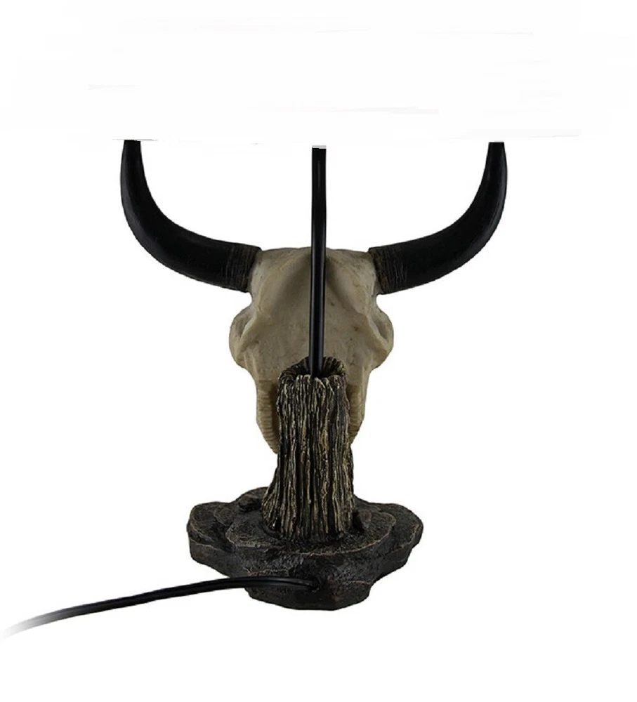 NOTE: DUE TO THIS IS A LAMP BASE ONLY, SHADE IS NOT INCLUDED this item is being sold as 'Scratch and Dent' at a reduced price (DAMAGE MAY VARY PER PRODUCT AVAILABLE). Please see available photos for damages. Capture the spirit of the wild and place this lamp in the living room, bedroom or out on your sheltered porch or patio. The black and white hand painted finish is weathered for a natural appearance. The light will cast a warm glow across the room with a Type A 40 watt maximum bulb (not included). Make your Southwest, country or Western-inspired decor really shine when you light this decorative cattle ranch table lamp! Our eBay Store About Us Add to Favorite Sellers Cattle Ranch Decorative Bull Skull Table Lamp Base Only NOTE: DUE TO THIS IS A LAMP BASE ONLY, SHADE IS NOT INCLUDED this item is being sold as 'Scratch and Dent' at a reduced price (DAMAGE MAY VARY PER PRODUCT AVAILABLE). Please see available photos for damages. NOTE - DUE TO THIS IS A LAMP BASE ONLY, SHADE IS NOT INCLUDED this item is being sold as 'Scratch and Dent' at a reduced price (DAMAGE MAY VARY PER PRODUCT AVAILABLE). Please see available photos for damages. Creatively Crafted of Resin in Eye-Catching Detail Hand Painted Weathered and Aged Finish for a Natural Appearance Uses 1 Type A 40 Watt Maximum Bulb (not included) NOTE: DUE TO THIS IS A LAMP BASE ONLY, SHADE IS NOT INCLUDED this item is being sold as 'Scratch and Dent' at a reduced price (DAMAGE MAY VARY PER PRODUCT AVAILABLE). Please see available photos for damages. Capture the spirit of the wild and place this lamp in the living room, bedroom or out on your sheltered porch or patio. The black and white hand painted finish is weathered for a natural appearance. The light will cast a warm glow across the room with a Type A 40 watt maximum bulb (not included). Make your Southwest, country or Western-inspired decor really shine when you light this decorative cattle ranch table lamp! Product Details Color Beige Height 19.5 Length 13 Weight 3.65 LB