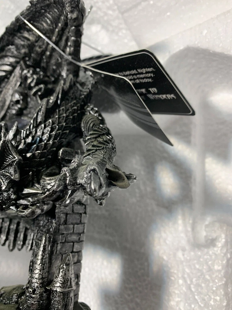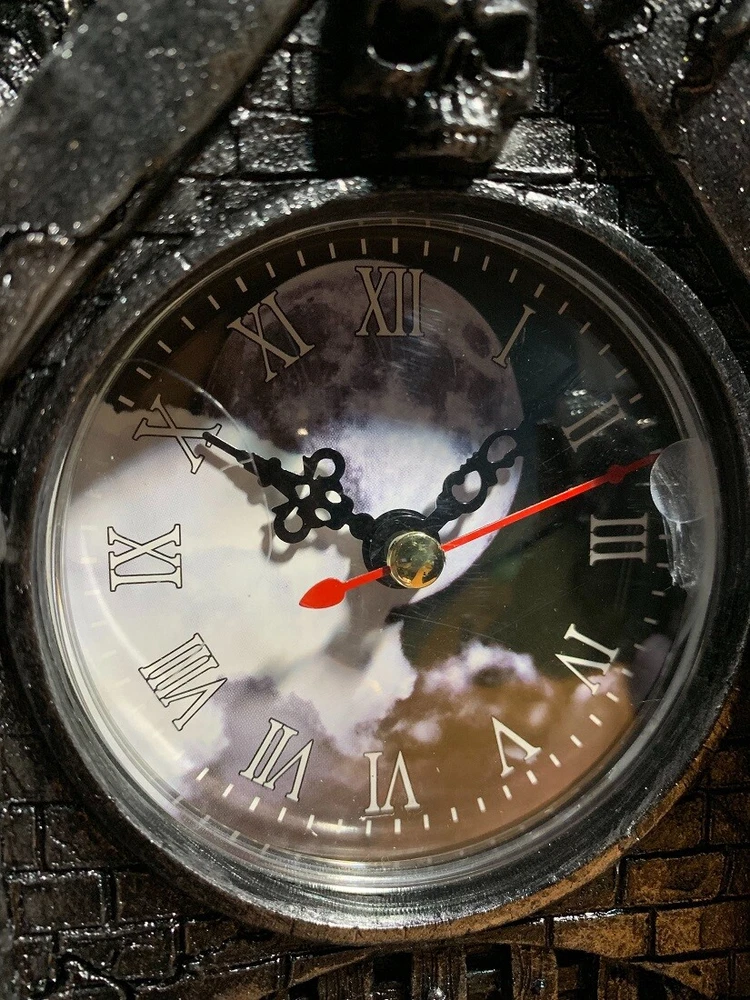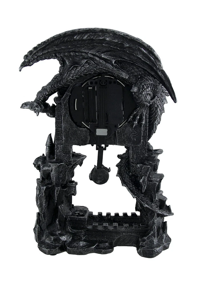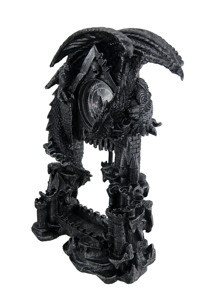 Made of cold cast resin, this incredibly cool battery powered desk or mantel clock features a pentagram pendulum and has an evil looking dragon perched atop it. The clock face features black hands and white markers. It measures 13 1/4 inches tall, 9 inches wide and 4 1/2 inches deep. It runs on one AA battery (not included). NOTE: DUE TO A BROKEN CLAW AND/OR SCRATCHES/SMUDGES ON THE CLOCK FACE this item is being sold as 'Scratch and Dent' at a reduced price (DAMAGE MAY VARY PER PRODUCT AVAILABLE). Please see available image(s) for an example. `Scratch and Dent` items are sold `as is` and all sales are final. Our eBay Store About Us Add to Favorite Sellers Evil Dragon Pentagram Pendulum Mantel Clock NOTE: DUE TO A BROKEN CLAW AND/OR SCRATCHES/SMUDGES ON THE CLOCK FACE this item is being sold as 'Scratch and Dent' at a reduced price (DAMAGE MAY VARY PER PRODUCT AVAILABLE). Please see available image(s) for an example. `Scratch and Dent` items are sold `as is` and all sales are final. 13.25 in tall, 9 in long, 4.5 in deep Runs On 1 AA Battery Cool Silvered Stone Finish Cold Cast Resin NOTE - DUE TO A BROKEN CLAW AND/OR SCRATCHES/SMUDGES ON THE CLOCK FACE this item is being sold as 'Scratch and Dent' at a reduced price Made of cold cast resin, this incredibly cool battery powered desk or mantel clock features a pentagram pendulum and has an evil looking dragon perched atop it. The clock face features black hands and white markers. It measures 13 1/4 inches tall, 9 inches wide and 4 1/2 inches deep. It runs on one AA battery (not included). NOTE: DUE TO A BROKEN CLAW AND/OR SCRATCHES/SMUDGES ON THE CLOCK FACE this item is being sold as 'Scratch and Dent' at a reduced price (DAMAGE MAY VARY PER PRODUCT AVAILABLE). Please see available image(s) for an example. `Scratch and Dent` items are sold `as is` and all sales are final. Product Details Color Pewter Height 13.25 Length 9 Weight