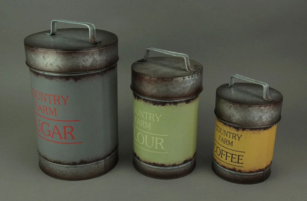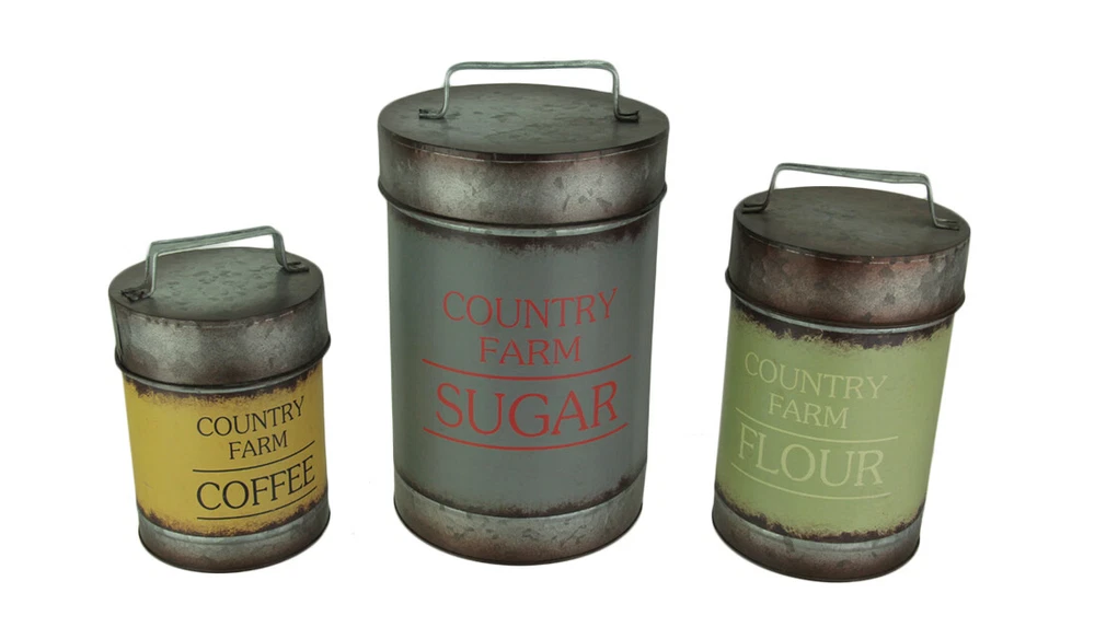 This set of 3 kitchen canisters is perfect for storing your coffee, sugar and flour, without having to deal with the bags they are sold in. Made of metal, they have a galvanized zinc finish, with a distressed, slightly rusty finish on the outside and hand painted labels. The largest canister, for sugar, measures 9.5 inches high, 6.5 inches in diameter. The flour canister is 9 inches high, 5 inches in diameter, and the coffee canister is 7 inches high, 4.25 inches in diameter. The canisters nest together when not in use to save space. They add a touch of country flair to any kitchen, and make a great gift. NOTE: DUE TO A DENT ON THE BOTTOM OF THE SUGAR CAN this item is being sold at a reduced price. Please see last photo for damages/defects. Our eBay Store About Us Add to Favorite Sellers Set of 3 Galvanized Finish Metal Kitchen Canisters NOTE: DUE TO A DENT ON THE BOTTOM OF THE SUGAR CAN this item is being sold at a reduced price. Please see last photo for damages/defects. NOTE - DUE TO A DENT ON THE BOTTOM OF THE SUGAR CAN this item is being sold at a reduced price. Please see last photo for damages/defects. Set of 3. Made of Metal, With A Distressed Galvanized Finish Hand Painted Labels Nest Together For Easy Storage Adds Country Flair To Any Kitchen This set of 3 kitchen canisters is perfect for storing your coffee, sugar and flour, without having to deal with the bags they are sold in. Made of metal, they have a galvanized zinc finish, with a distressed, slightly rusty finish on the outside and hand painted labels. The largest canister, for sugar, measures 9.5 inches high, 6.5 inches in diameter. The flour canister is 9 inches high, 5 inches in diameter, and the coffee canister is 7 inches high, 4.25 inches in diameter. The canisters nest together when not in use to save space. They add a touch of country flair to any kitchen, and make a great gift. NOTE: DUE TO A DENT ON THE BOTTOM OF THE SUGAR CAN this item is being sold at a reduced price. Please see last photo for damages/defects. Product Details Color Multicolored Height 9.5 Length 6.5 Weight 1.85 LB