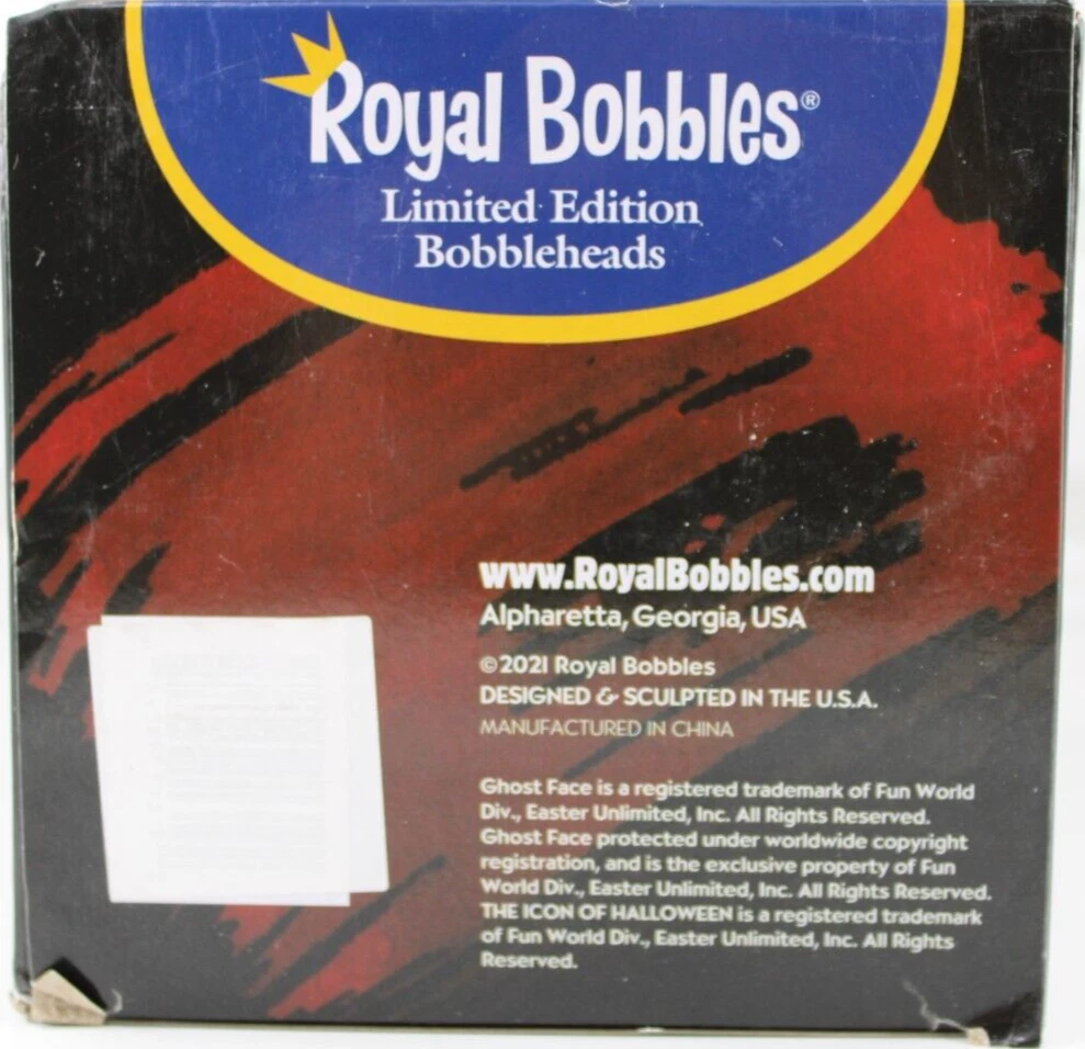 Scream Ghost Face Bobblehead Royal Bobbles Exclusive Limited Edition Horror New BRAND NEW, HORROR BOBBLEHEAD OF SCREAM ICON GHOST FACE 2021 THIS IS A RETALER EXCLUSIVE LIMTIED EDITION HORROR COLLECTIBLE VERY COOL DESIGN, HIGH QUALITY SCUPT VERY HEAVY AND WELL MADE FIGURE AWESOME HORROR MOVIE GREAT HORROR COLLECTIBLE BOBBLE HEAD FIGURE WAS INSPECTED CLOSELY AND IS IN EXCELLENT NEW CONDITION ✨✨✨✨ THE BOX IS IN FAIR CONDITION WITH SOME SHELF WEAR THERE IS A CASE OPENING CUT ON THE TOP LID ACROSS ABOUT HALF THE LID A MINOR TEAR ON THE TOP INSERT FLAP ABOUT AN INCH LONG THERE IS SOME CREASING ON THE SIDES AND CORNERS OF THE BOX MOSTLY TOWARDS TOP OF BOX WE TOOK SEVERAL PICTURES OF THE BOX CONDITION FOR REVIEW HAS BEEN IN STORAGE SINCE 2021, NEVER DISPLAYED OR OPENED UNTIL LISTING PLEASE SEE ALL PICS FOR DETAILS HAS THICK STYROFOAM PACKAGING TO PROTECT WHILE SHIPPING STYROFOAM PACKAGING IS SOLID AND IN VERY GOOD CONDITION WOULD MAKE A GREAT GIFT ADD TO YOUR COLLECTION ✨✨✨✨✨✨✨✨✨✨✨ The VinKris Collection is committed to delivering a great experience! We will ship to you with the greatest of care All items are shipped in sturdy boxes We use packing materials appropriate for the product to help ensure safe delivery Shipments to the United States and Protectorates are handled via USPS International shipments will ship via Ebay's International Shipping Program All packages are shipped within 1 business day of payment We ship daily Monday through Saturday Worry free purchases, we stand behind everything we sell with free 30 day returns We have thousands of happy customers and our goal is 100% customer satisfaction We are happy to answer any questions