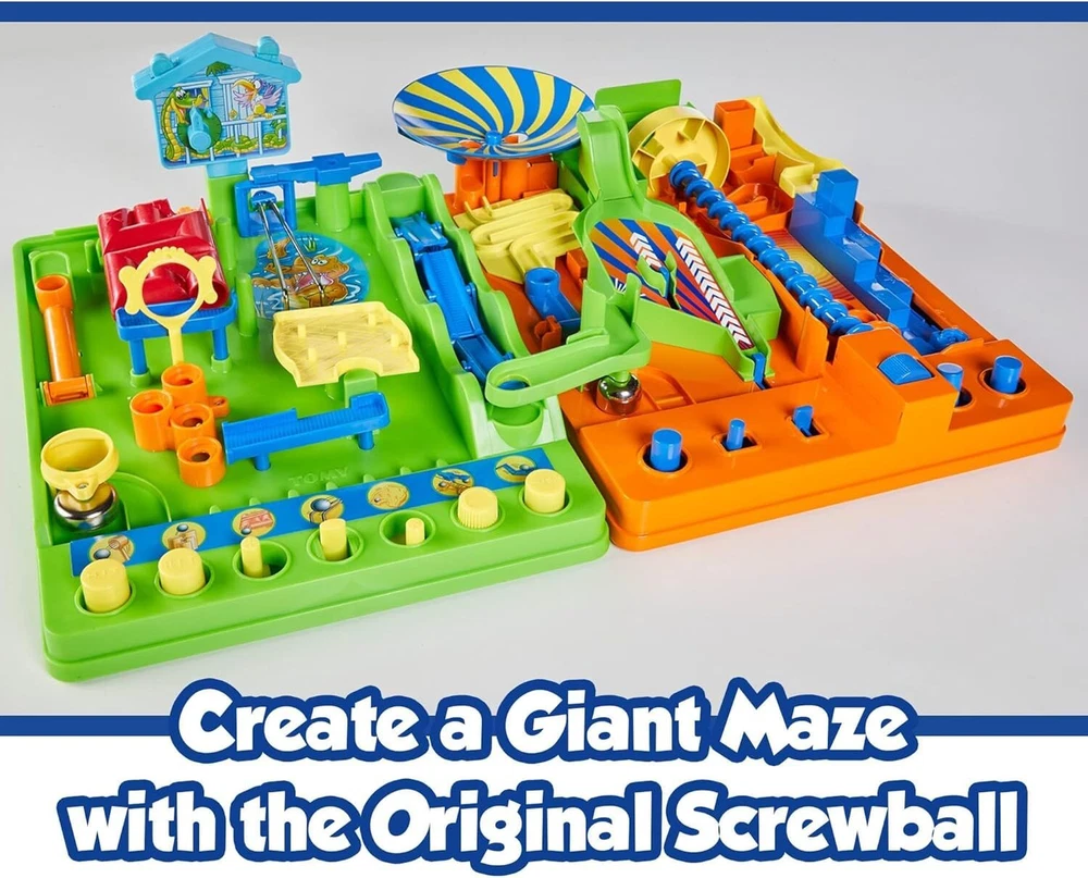 A New Take on a Classic Family Game: Screwball Scramble 2 dishes up all kinds of new challenges and is an add-on to the most popular game where players guide their marble through the labyrinth Family Game Night: Play on your own to become a Screwball master or take on family and friends to see who's the fastest Games for Hand Eye Coordination: Use skill and patience to control the sliders, wheels and buttons that operate each obstacle, honing motor skills as kids master each task Double the Fun: Screwball Scramble 2 is compatible with the original TOMY board game (sold separately); lock the two mazes together with a connecting bridge for a super-challenging game! Game Night Excitement: Screwball Scrambles kids games are fantastic for 1-4 players ages 5 and up Time ticking, heart racing! Will you make it through the maze on time? Screwball Scramble 2 tests your coordination and skill on a topsy-turvy journey through a table-top maze full of brand new surprises. Control the action with clearly marked buttons; twisting, turning, guiding and triggering the obstacles in different ways to guide your screwball through each one. From zany zig-zag steps to a fantastic Ferris wheel maze, and from the crazy corkscrew challenge to a catapult blast and much more, it’s a wild course full of fun to conquer before you ring the finish bell! Play solo or take on family and friends on game nights! Fastest through the maze wins! For even more of a challenge, connect Screwball Scramble 2 to the classic Screwball game (sold separately) by using the included bridge. Now you have an even more exciting maze that doubles the fun for friends and family! This kids' marble game is a fantastic addition to game night and is a perfect gift for girls and boys ages 5 and up.