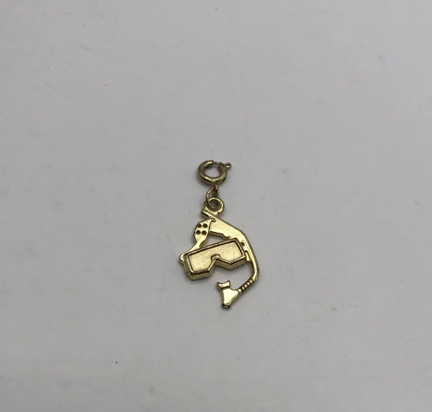 Add a touch of oceanic charm to your bracelet or necklace with this Scuba Mask and Snorkel Charm. Crafted with a gold tone finish, this charm features a spring ring closure and is perfect for those who love water sports. The charm is designed with a unique style and is ideal for adding a touch of personality to your jewelry collection. Whether you're a fan of scuba diving or just love the ocean, this charm is a must-have.
