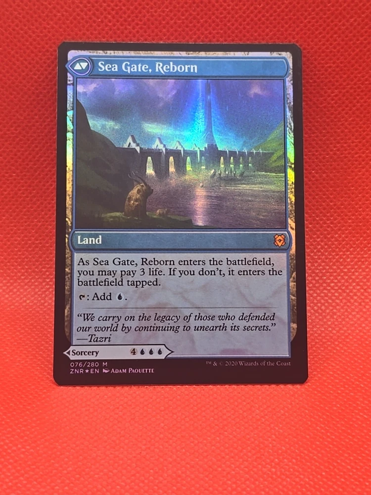 Elevate your Magic: The Gathering collection with the Sea Gate Restoration card from the Zendikar Rising set. This mythic rarity sorcery card, illustrated by the talented Adam Paquette, features a stunning foil finish that captures the essence of its power. With its card number 76, it's a formidable addition to any deck, offering a unique combination of utility and aesthetic appeal. Not only does Sea Gate Restoration offer the strategic depth players have come to expect from Wizards of the Coast, but it also boasts a rich blue color that aligns perfectly with your deck's theme. The English language card is ready to be the centerpiece of your collection or to take command on the battlefield. Its specialty as a restored card only adds to its allure for both collectors and players alike.