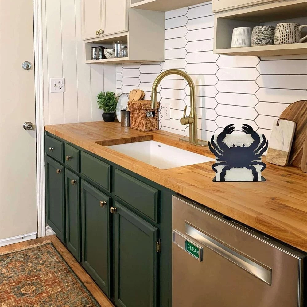 About this item ZZHMASPLAY Napkin Holder - 1.58"D x 5.43"W x 4.65"H perfect size is suitable to hold standard size square paper napkins. While its compact size allows you to conveniently display the napkin dispenser on a table or counter top surface Durable and Sturdy Construction: Made from wear resistant iron with finger-proof coating, which can effectively prevents fingerprint. Also with anti-slip bottom pad design, this napkin holder will not scratch the table top, very sturdy and durable to use. Simple and Elegant Home Decor: Stylish cutout metal Crab design, simple and elegant, suitable for a wide range of occasions such as kitchen, party, picnic and cafe. Ideal For Indoor & Outdoor - Use the free-standing tissue holder at the dinner table, or in the kitchen counter next to the sink. Also, can be used outside for a cocktail napkins, picnic or BBQ etc. This simple, elegant metal tissue dispenser is a great addition for daily use. Easy to Clean: For hassle-free clean up, the whole napkin holder is made of solid metal without small parts, just use running water to wash, or simply wipe with a rag, then you can make the napkin holder clean as new.