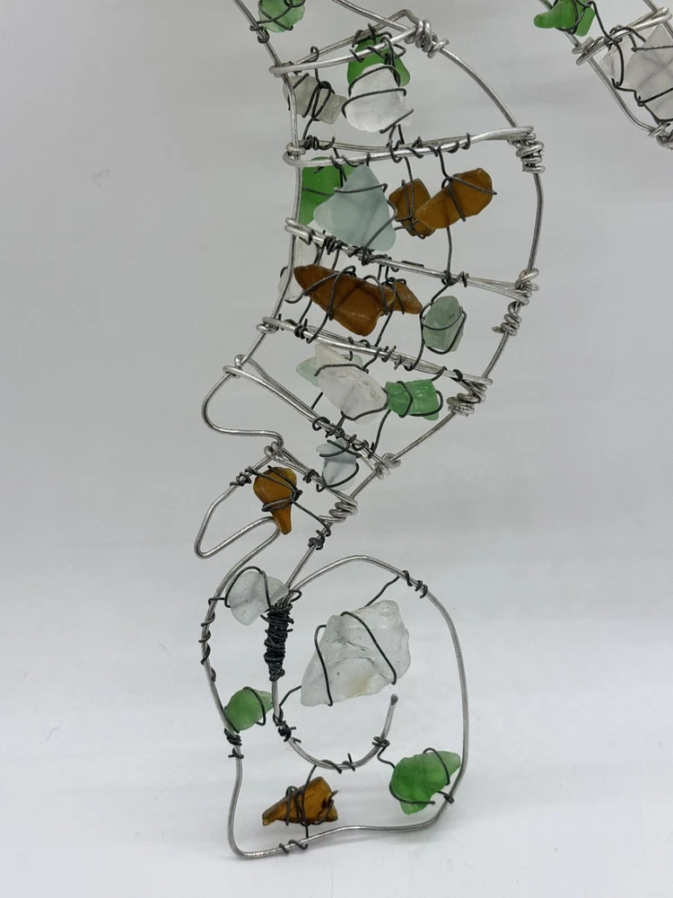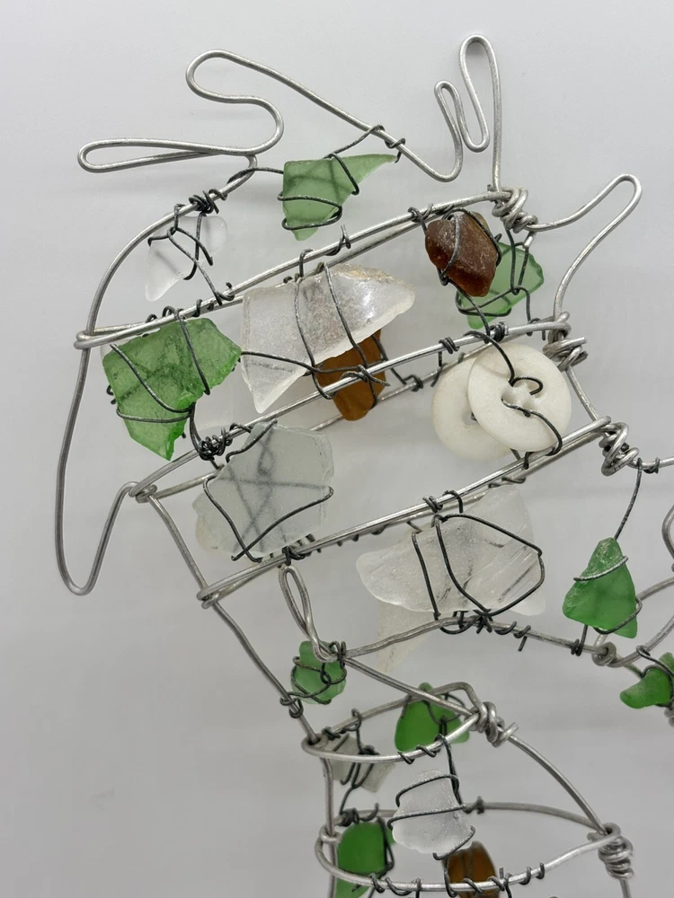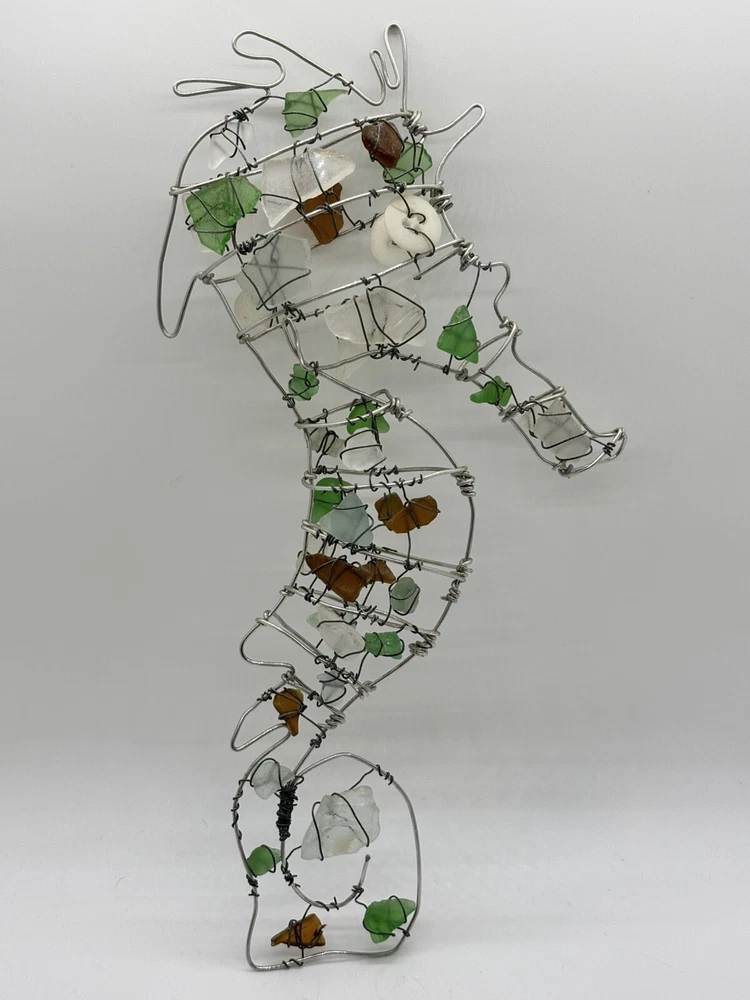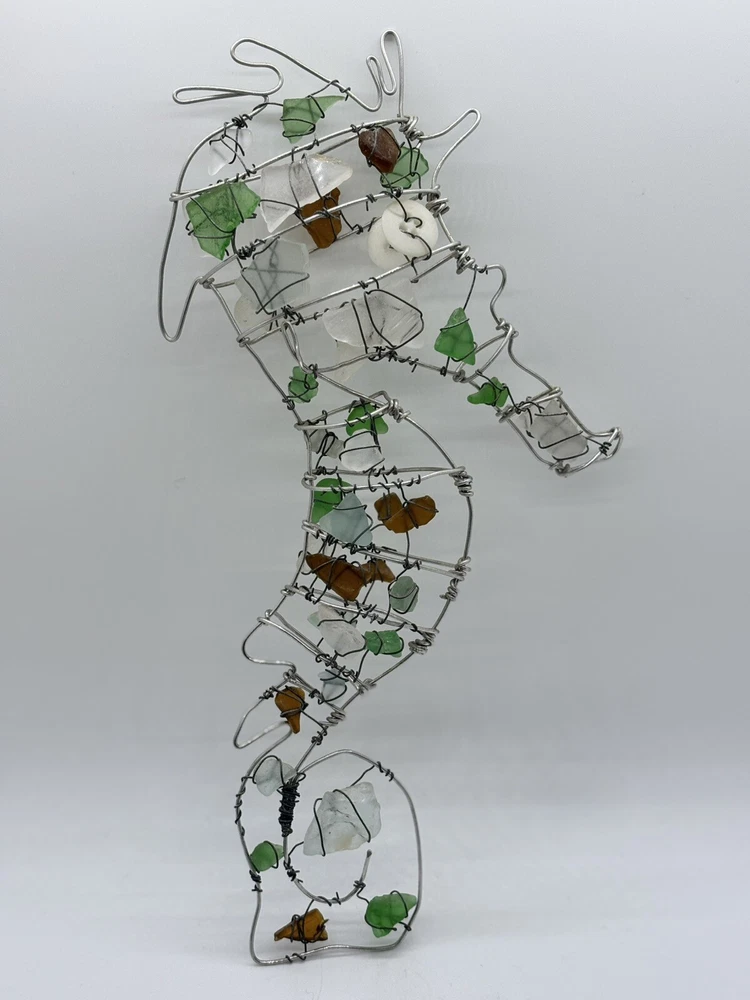 Folk Art seahorse made from a wire frame and embellished with sea glass. Sweet button eyes 10”long No missing pieces