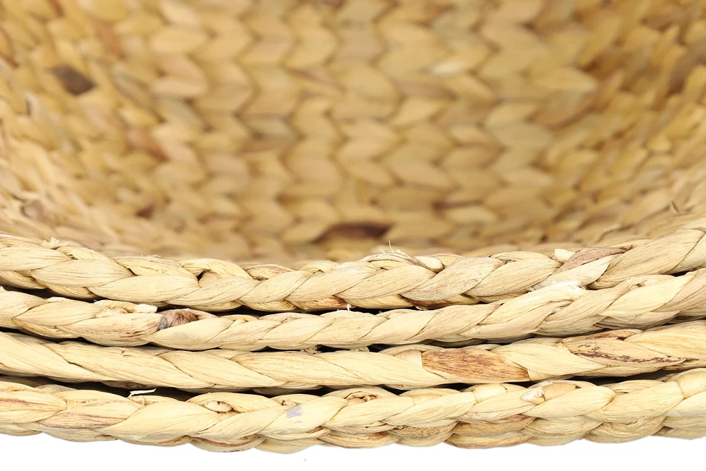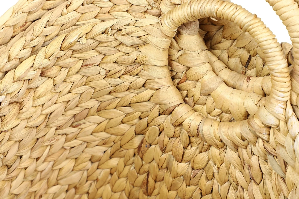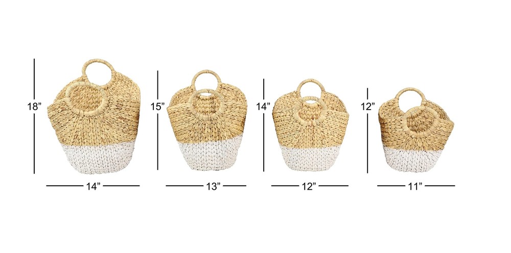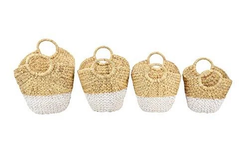 Use in your living room as home storage for throw blankets and pillows, bathroom for towels, or anywhere in the house as decorative baskets. This item ships in 1 carton. Due to the handmade nature of these, there will be slight color, shape, and size variations, as well as loose fibers. Suitable for indoor use only. This item ships fully assembled in one piece. Maximum weight limit is 5 lbs. Made in Vietnam. This brown colored basket organizer comes as a set of 4. Contemporary style. CONTEMPORARY THEME Embrace artistic expression with a style that highlights bold designs with sleek lines, neutral elements, and a minimalist aesthetic MADE OF SEAGRASS These wicker storage baskets are woven using dried water hyacinth fibers BROWN AND WHITE UNFINISHED FINISH Natural light beige water hyacinth rattan is braided into staggered oval shapes with curved silhouettes and circular handles FEATURES OVAL STORAGE BASKET Four nesting, oval, natural wicker baskets with white color blocking and easy-carry handles 4 PIECES CONVENIENTLY SIZED This item measures 17L x 15W x 17H, 15L x 14W x 15H, 13L x 13W x 14H, 12L x 11W x 13H inches, and weighs 6 lbs