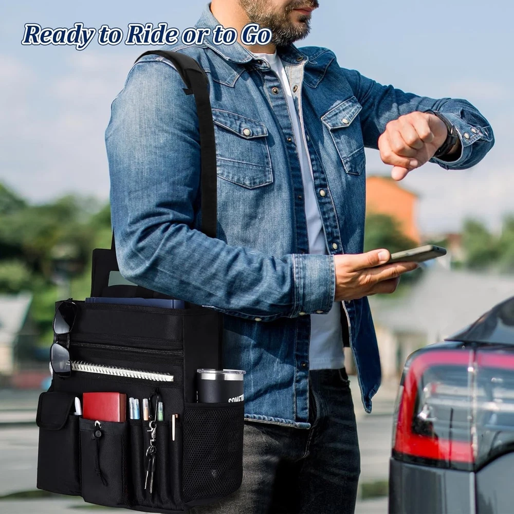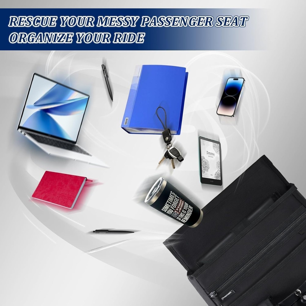Stay Organized on the Road: This car seat organizer keeps your vehicle tidy with essentials close at hand. Perfect for project coordinators, truckers, brokers, and other on-the-go professionals who spend long hours on the road! Large Storage Space: Features a 17" x 5" padded section for laptops up to 18", space for up to 3 ring binders with a mesh divider, and a zippered pocket for important documents. Also includes an outer slip pocket, 2 bottle holders, 2 small utility pockets, and 4 pen slots. An ideal addition to your car accessories collection for an organized ride! Built to Last with Convenience: Constructed from durable 600D fabric with 1.5" tough straps, a heavy-duty zipper, and a reinforced padded back, this truck organizer offers superior durability and structural integrity. The extra-large zipper pull provides quick access to valued items easily, making it a reliable part of your truck accessories! Ultimate Versatility Car Organizer: Two adjustable straps with hardened buckles ensure secure stability, allowing it to serve as a passenger or back seat organizer without sagging. Easily converts into a shoulder-carrying bag when needed, the best choice for flexible use on and the road! Make Your Ride Smoother and Safer: Designed to keep everything organized and within reach, this versatile car organizer helps you stay focused on the road. Enjoy a clutter-free, stress-free journey with essentials securely stored and easily accessible!