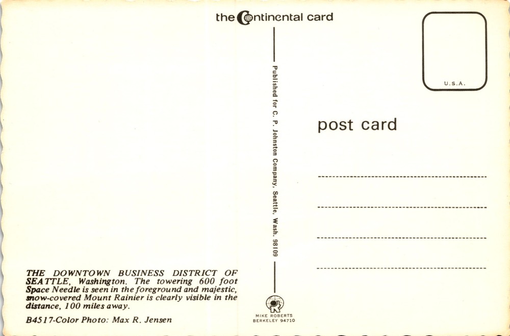 MAKE AN OFFER. THE MORE YOU BUY THE BETTER DEAL I WILL ACCEPT The postcard features a vibrant color photo of the downtown business district of Seattle, Washington. In the foreground stands the iconic Space Needle, a 600-foot observation tower built for the 1962 World's Fair. The Space Needle offers panoramic views of the city and surrounding area.