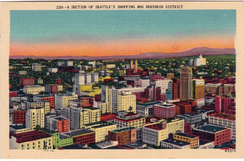 For sale is a postcard featuring an aerial view of the Seattle (Washington) Shopping & Business District. The card is in very good used condition as pictured. Very minor signs of light use and handling. Posted, with handwriting on reverse. Shipping: The default shipping cost is for shipping in an envelope with NO PADDING. If you prefer cardboard padding for extra security, please choose the more expensive shipping method at checkout. Combined shipping rates provided upon request prior to purchase. Please contact with any questions or requests for additional photos.