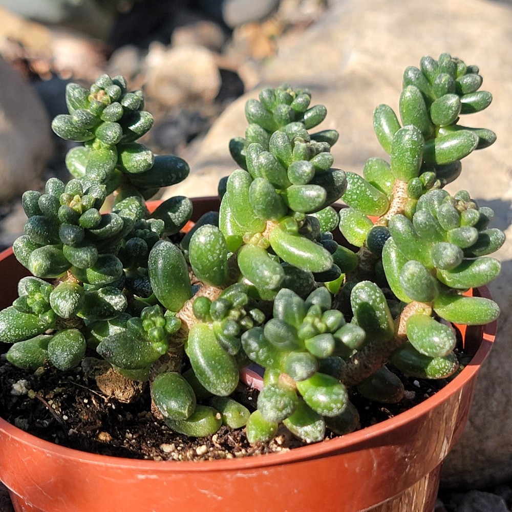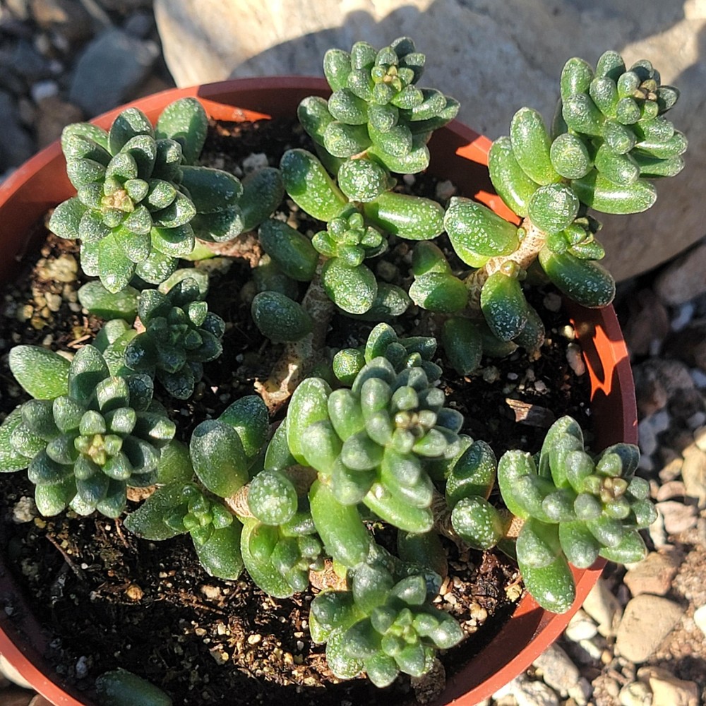 Sedum furfuraceum , commonly known as Bonsai Sedum , is a compact and slow-growing succulent that is highly prized for its unique, bonsai-like appearance. Native to the arid regions of Mexico, this plant features small, rounded, and tightly clustered rosettes of thick, fleshy leaves that are a pale, grayish-green color, often tinged with purple or reddish hues when stressed by sunlight or drought. The stems are short and dense, creating a bushy, almost miniature tree-like shape, which is why it is often compared to bonsai trees. Sedum furfuraceum thrives in well-draining soil, preferring bright light and minimal watering, making it a perfect addition to a rock garden or a potted display. In late spring or summer, it may produce small, star-shaped yellow flowers that attract pollinators like bees, though its primary appeal lies in its sculptural form rather than its blooms. This succulent is particularly popular for use in indoor gardens, containers, and terrariums, where its manageable size and striking appearance make it a standout. Like many sedums, Sedum furfuraceum is highly drought-tolerant and requires little maintenance, making it an ideal choice for those looking for an attractive, low-care plant. Please Note: Plant will ship bare root with little to no dirt, and you will receive a plant similar to the one in the photo. Fragile: leaves may curl, fall off, or bruise during shipping. Will recover with proper light, water, and leaf shedding. Returns & exchanges: Not accepted Please contact us if you have any issues with your order