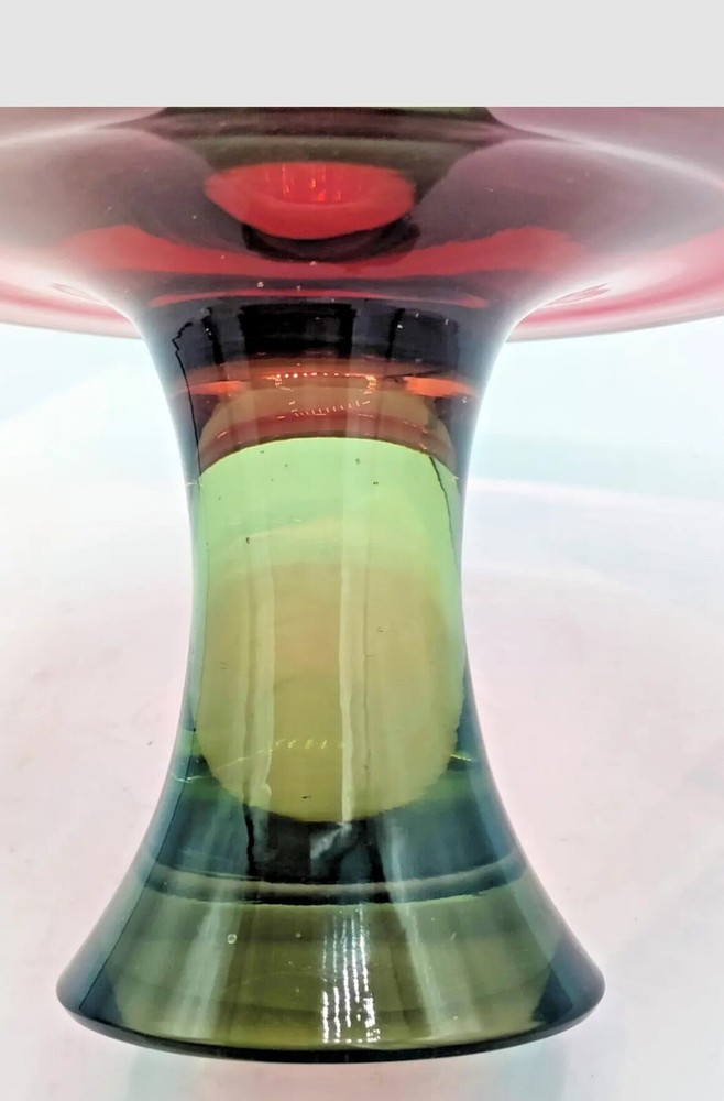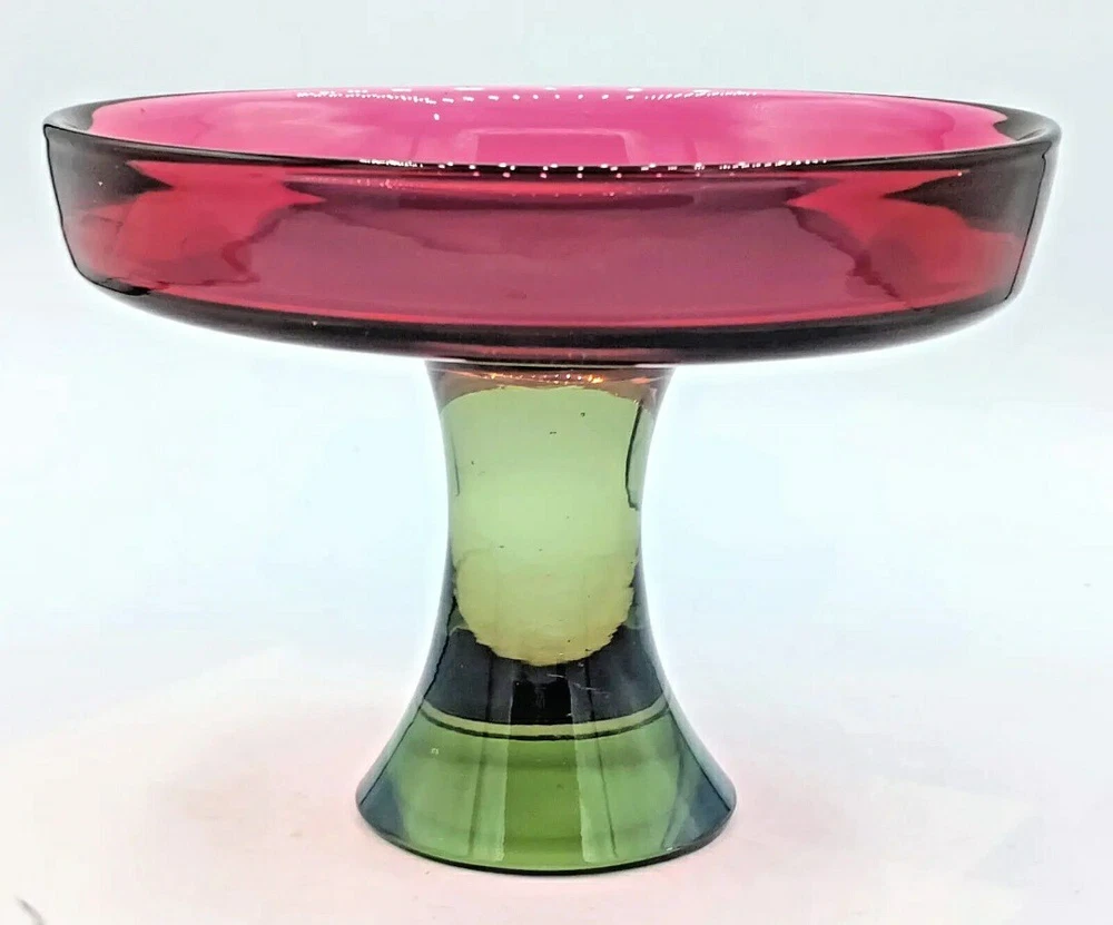 Seguso Vetri d'Arte Murano Sommerso Pedestal Compote Dish 1960s This is a beautiful Murano pedestal dish, according to the Murano glass group I sent pictures to, this is most probably manufactured by Seguso Vetri d'Arte 1960's. Here is what a group expert said " The olive green/grey is reminiscent of SVdA and Cenedese pieces made in the 1960's. Mario Pinzoni used it alot when he took over from Poli. Cenedese has used similar in sommerso etc The watermelon/pink glass reminds of colours used by Cenedese (especially in Scavo pieces). It looks a bit pink for SVdA but it could have a translucent opalina covering that would change the violet/ruby colour they use." I call it my watermelon compote, the color is the prettiest raspberry red and green, all one piece. Wouldn't you say this is perfect for Christmas! Watermelon Colors too!! Measures 7-1/4" tall x 5-1/4" across. Weighs 2 pounds 9 ounces. Excellent condition, no chips or cracks. there is some scratches on the super highly polished bottom as shown in the photo. Please message me if you have any questions, Thanks for viewing!