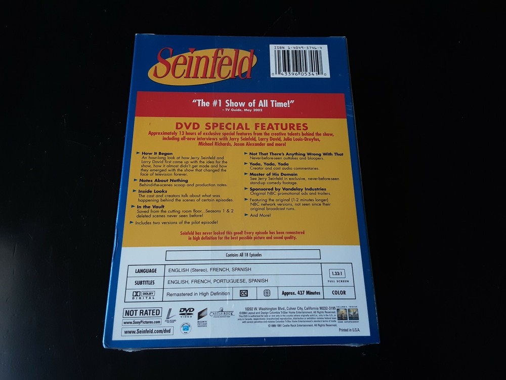 Language:EnglishRun Time:414 min.Director:Art Wolff, Tom CheronesFormat:DVDSub-Genre:Box Setsgtin13:0043396409767Studio:Sony PicturesItem Weight:0.35 lbItem Width:5.35 inUPC:0043396409767Movie/TV Title:Seinfeld: the Complete First and Second SeasonsItem Length:7.35 inCountry/Region of Manufacture:MexicoItem Height:0.58 inNumber of Discs:4Genre:TV ComedyProducer:Paul TibbittRating:NR