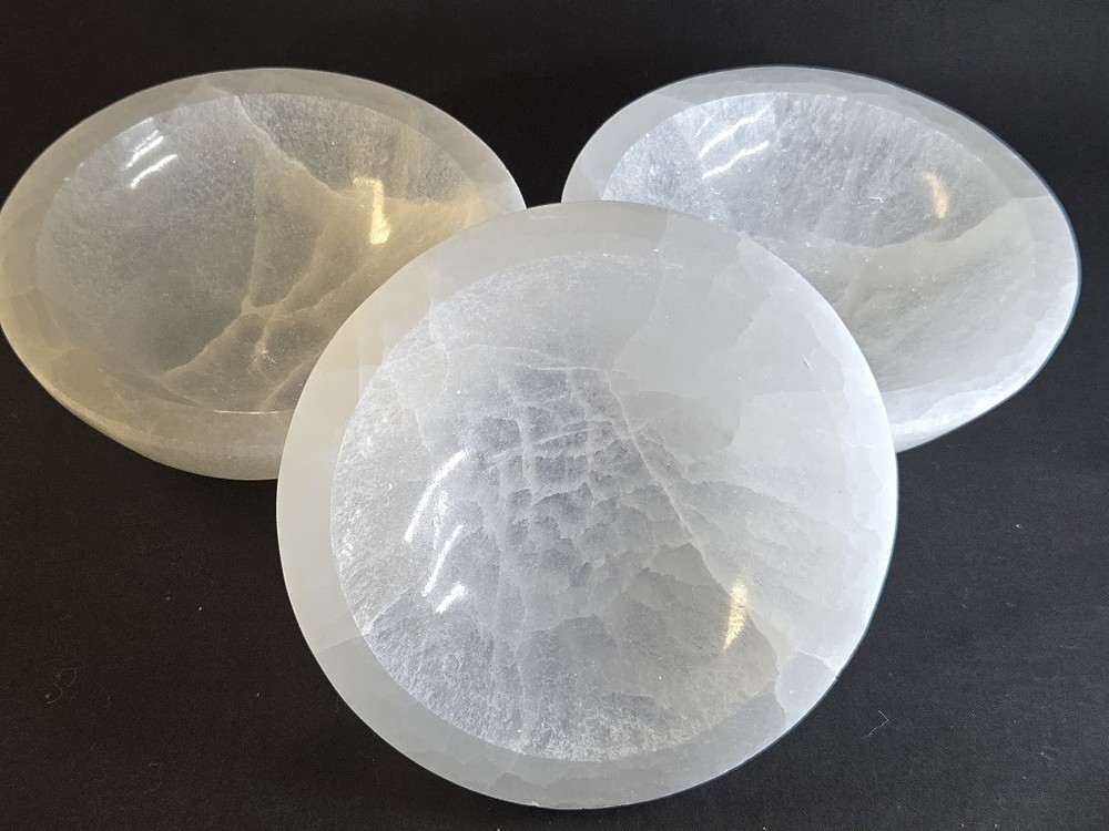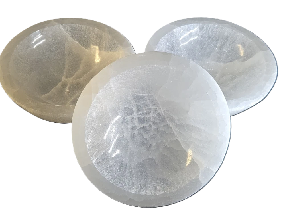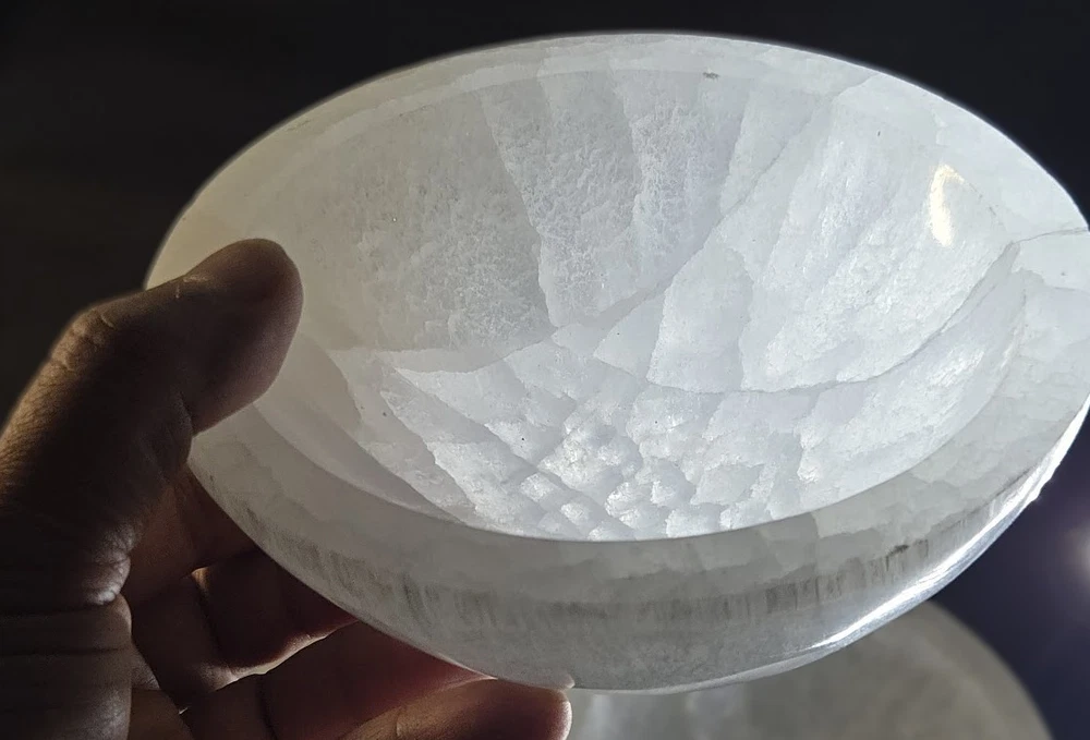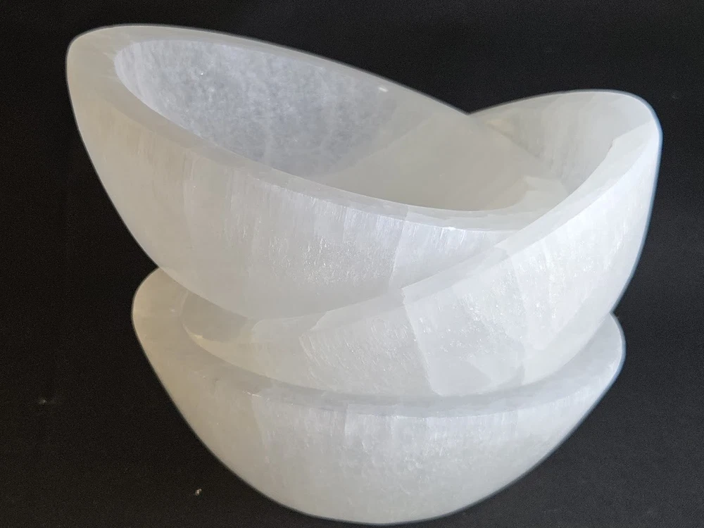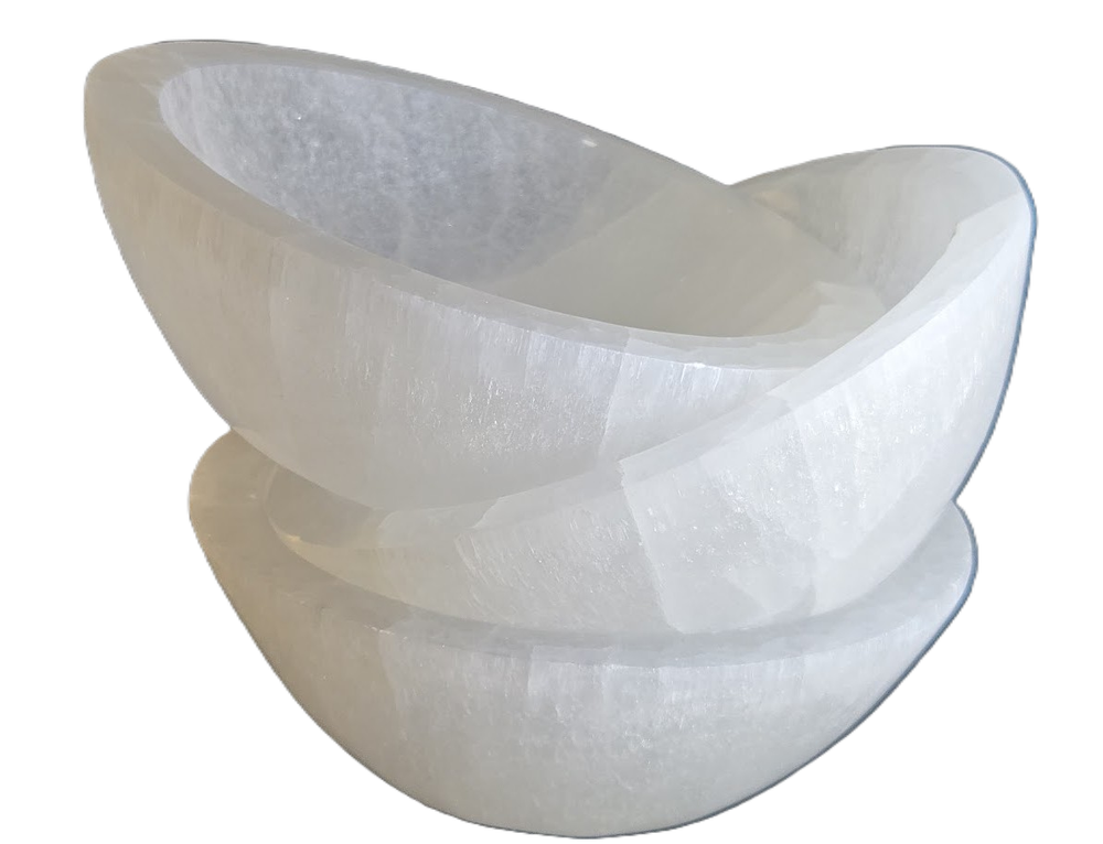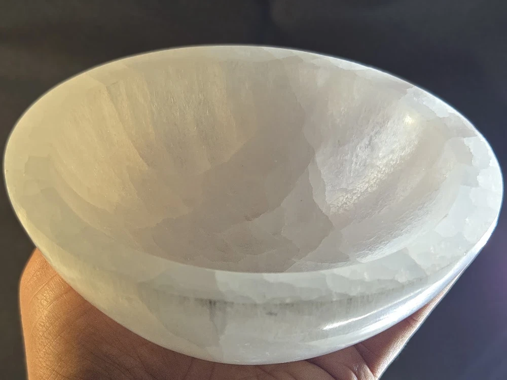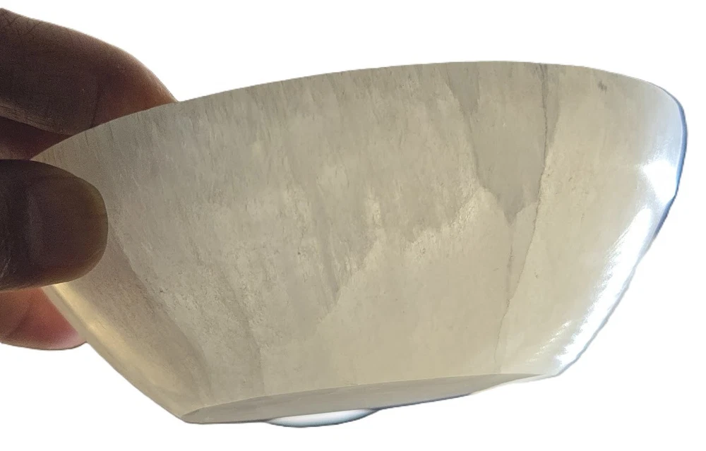 Elegantly Hand carved Into Bowl Shape from 100% GENUINE NATURAL SELENITE CRYSTAL selected from Morocco. The large size measures about 5.5+/- inches across the top of the outer rim, and weighing approximately 1.4 pounds (637 gm +/-). The exceptionally luminous, pearly appearance offers a beautiful, unique artifact, that fits well with cozy interior decor trends and symbolizes pure love. Metaphysically, selenite is believed to promote calm, emotional healing, and harmony. It is known to be associated with peace and mental clarity. It is thought to reduce stress and create a tranquil, loving environment in the home, particularly in bedrooms.