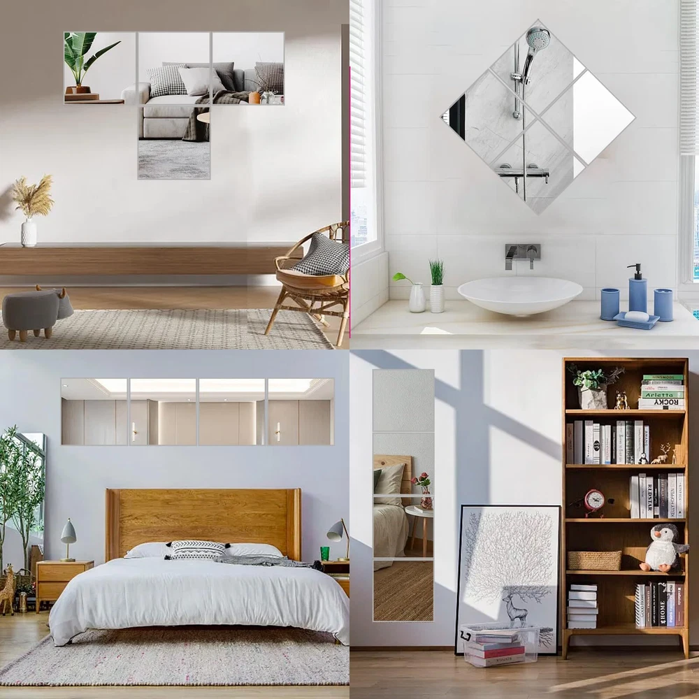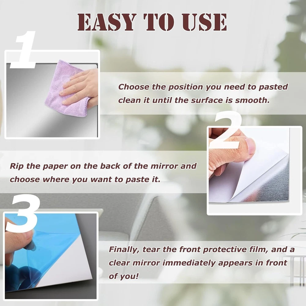 【Acrylic Material】:The mirror is made of acrylic material,with a smooth surface and good texture,which can avoid scratches and is safer than ordinary glass mirrors. 【Reflective Effect】:Our acrylic mirror has a reflective effect, which can be used for exquisite decoration. Reflective surfaces can make the space look larger and brighter.Use mirror stickers on smooth surfaces, the flatter the wall, the better the reflective effect. 【Easy To Install】:Just tear off the white tape on the back and stick it where it needs to be,without tools,no need to punch & no damage walls.It can be easily installed on smooth walls,latex paint walls or wooden doors.but don't use for uneven wall.Each mirror is covered with a protective film to avoid scratches, just peel it off to get a high-definition mirror. 【Safe and Unbreakable Mirror】: The acrylic mirror tiles is not glass,can be bent freely,unbreakable and safe.You can cut the mirror plate into any shape to DIY decorate the wall as you like.Don't worry about hurting the . 【Wide Applications】: Flexible mirror sheets stickers mirrors can be used as full-length mirrors,wall mirrors,fitness mirrors,yoga mirrors.Suitable for bathrooms,bedrooms,living rooms,dressing rooms,doors,offices,hotels and any place where mirrors are needed.