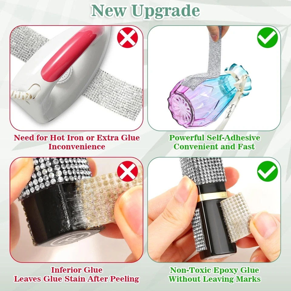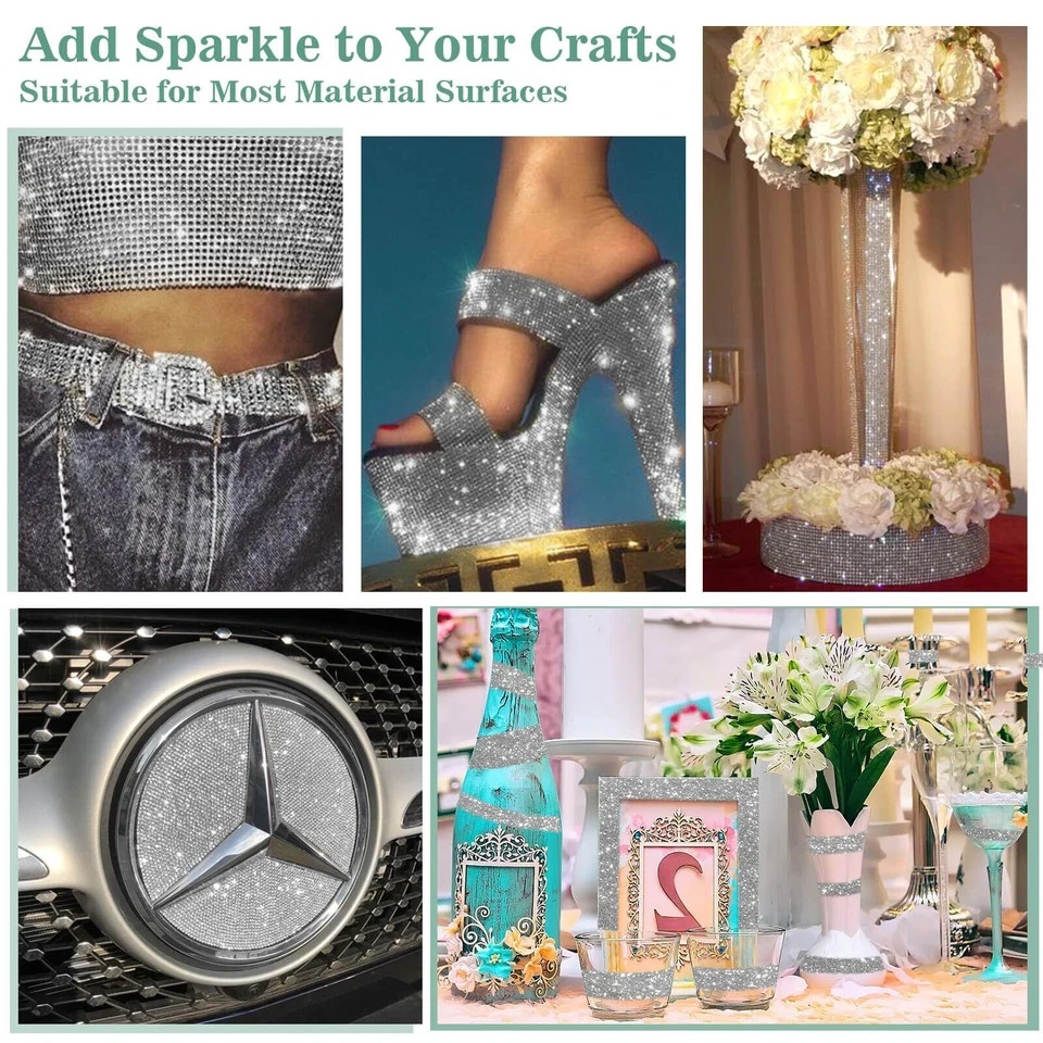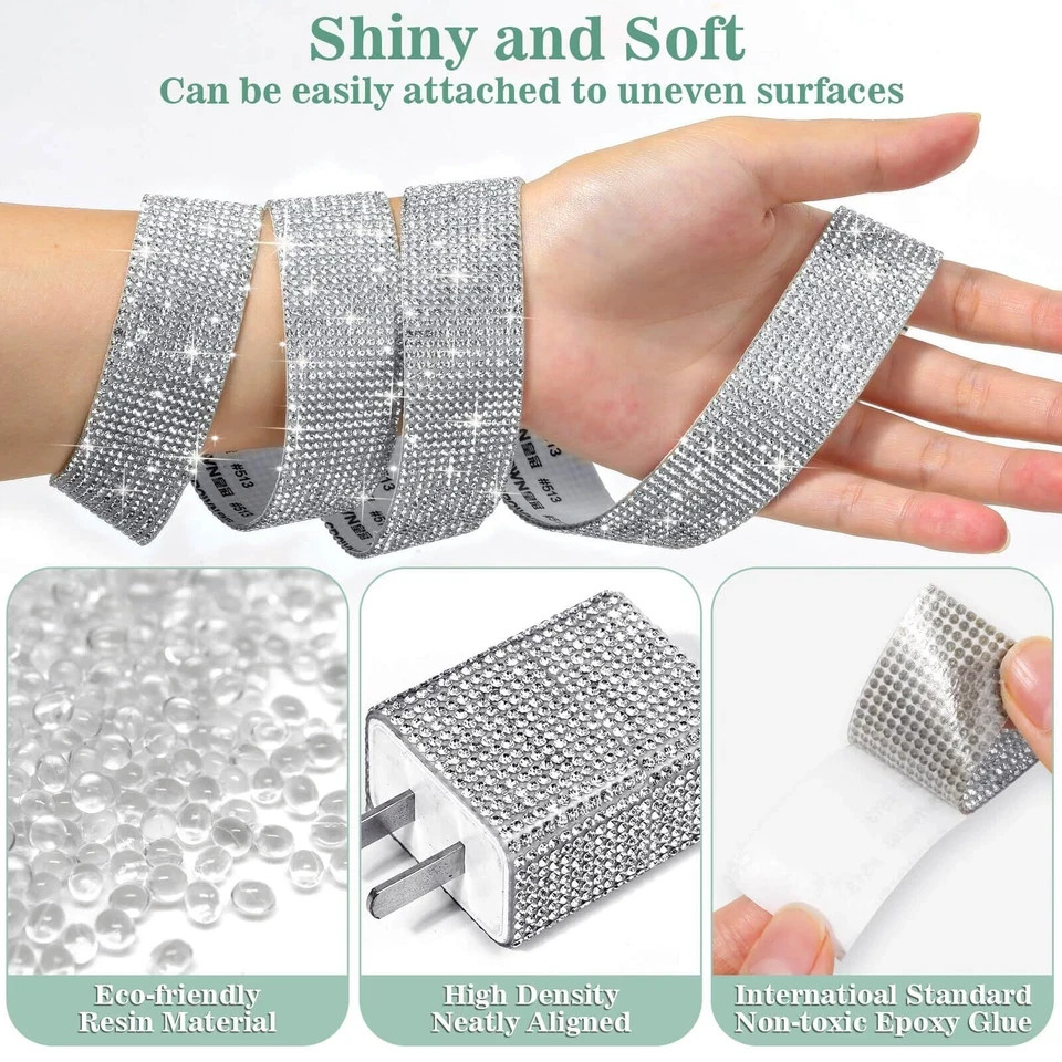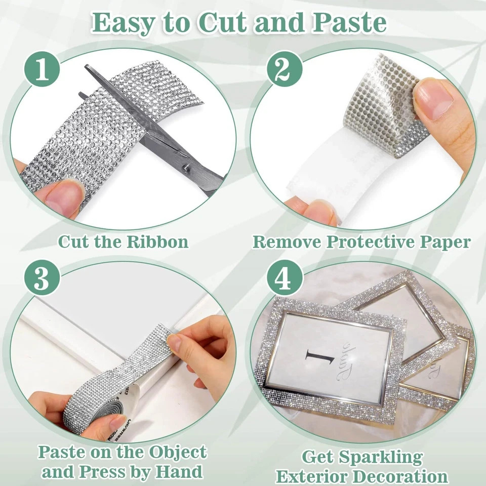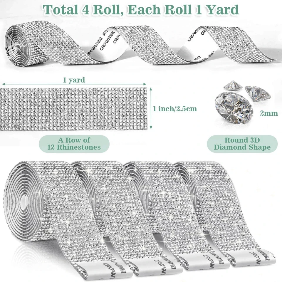 100% Money Back Guarantee if you are not satisfied with your purchase! ___________________ Description: The rhinestone ribbon set includes 4 rolls of silver self adhesive rhinestone strips, each roll is 1 yard long, a total of 4 yards. Each rhinestone is 2mm in size and the width of rhinestone ribbon roll is 1 inch. Long enough to let you make many sparkling decorations, for DIY decoration lovers, it will let you get unexpected bling wrap effects. 【Sparkling Rhinestones】 The rhinestones are made from eco-friendly resin, with a shiny 3D appearance. They are fixed onto the rhinestone roll using high-temperature melting technology, making them resistant to strong abrasion and not easily falling off. The rhinestones on the surface of the rhinestone tape are high-density design, neatly arranged and uniform in size, the surface feels very comfortable and will bring an excellent visual effect to your decorations. 【Easy to Cut and Customize】 The rhinestone strips are very soft and easy to bend, can be easily cut horizontally or vertically with scissors to any shape, easily twist and wrap around the surface of various shapes of decors, allowing you the flexibility to match as you wish. Rhinestone strips can be used indoors or outdoors, they will not deform easily after pasting and can keep their original shape for a long time. However, avoid soaking the rhinestone tape in water for an extended period. 【Strong Adhesion】 The back of our rhinestone ribbon has a strong adhesive, just peel off the protective paper and stick it to the desired position. It is very easy to use and no extra glue is needed. The self-adhesive on the back side has been integrated processing, so removing the rhinestone tape will not leave any adhesive traces on the surface. Additionally, the self adhesive rhinestone strips are lightweight, you can paste them on fabric, leather, wood or metal, they will not add a burden to the item. 【First Choice for Decorative Gifts】The self adhesive rhinestone strips is perfect for decorating dressers, shoes, wine bottles and clocks. Additionally, you can use the rhinestone tape to create handmade gifts for your friends and family or to decorate for special festivals like weddings, birthdays, graduation ceremonies, Christmas and anniversaries. The sparkling silver rhinestone tape is a nice way to add glamour to any celebratory event and will make your decorations stand out. ________________________ 100% Money Back Guarantee: We offer 30 Day Money Back Guarantee from the day you purchased if you’re not satisfied with your product. If you have any questions about our products, please contact us as soon as possible. Customer satisfaction is our absolute priority. Shipping: We are always working hard to ensure your package arrives as soon as possible. Please understand that some factors like weather, high postal traffic, and the performance of shipping companies are outside of our control. We offer free shipping to the lower 48 states and ship within 3 business days of payment, usually sooner. We do not accept P.O. Boxes. Please provide a physical address. You will be notified via eBay messages as soon as your items ship. Delivery: We will ship out the item in 2-3 working day after receiving the payment. Usually the delivery takes 2-5 business days. If you don't receive the items after 10 days, please feel free to contact us. You will get a replacement or a full refund. Please DO NOT open a return request or leave negative feedback without asking for help . Returns (Get Free Return Label): We offer a 30-Day Return Policy on defective/wrong items or items which you are not completely satisfied with. You have the option for a full-refund or an exchange of the item. No need to buy eBay return label. Contact us via eBay messages and get free return label. Returned items must be in all of the original packaging and include all of the original accessories or items that came with it. The item and package should be in original condition. Contact Us: Any queries or issues incurred, please feel free to contact us via eBay message, we will get back to you within 24 hours. Please DO NOT open a return request or leave negative feedback without asking for help. Feedback: Your feedback is very important to us. After you get your package and you are satisfied with our service, please leave us positive feedback. We are highly appreciated for your POSITIVE feedback and 5 stars. Enjoy shopping.