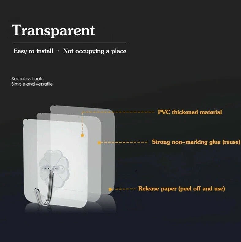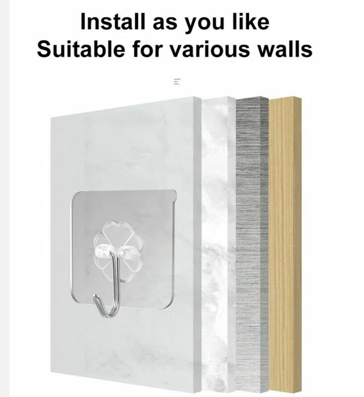 Self Adhesive Strong Sticky Hooks Heavy Duty Wall Seamless Transparent Hooks Description: No trace hook, tear off the film and stick Anytime, anywhere, no matter where you want to paste, which is the non-destructive wall frosting transparent design Stick with your heart and release it whenever you want No need to punch holes, gently stick to the wall anytime and anywhere Suitable for all kinds of wall materials Marble glass brick wood stainless steel... 1.Adoption of high-quality material, the clothes hook is durable and long-lasting use. 2. Transparent Design, The hooks look very sleek and modern. They are practically invisible when mounted on panelling, etc. 3.Super strong suction performance allows it securely to stick to smooth surfaces, shower walls and kitchen walls. 4.Works perfectly in your kitchen, bathroom and restroom. 5.Great hooks for towels, loofahs, spatulas and other household articles, making your room tidy and organized. 6.Easy to install and remove. With the suction buckle designed, no need to drill through the wall and you can easily install the hook on the wall. 7.Ideal for using at bathroom, kitchen, living room, bedroom and so on.