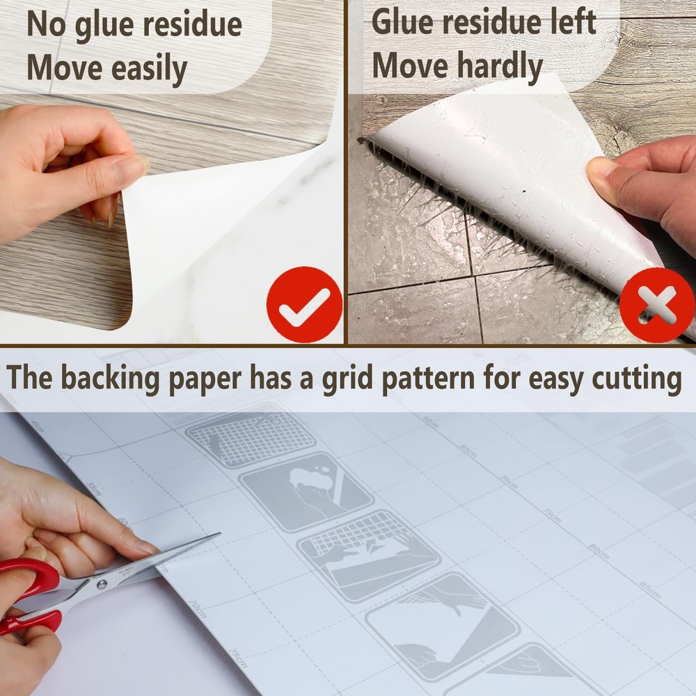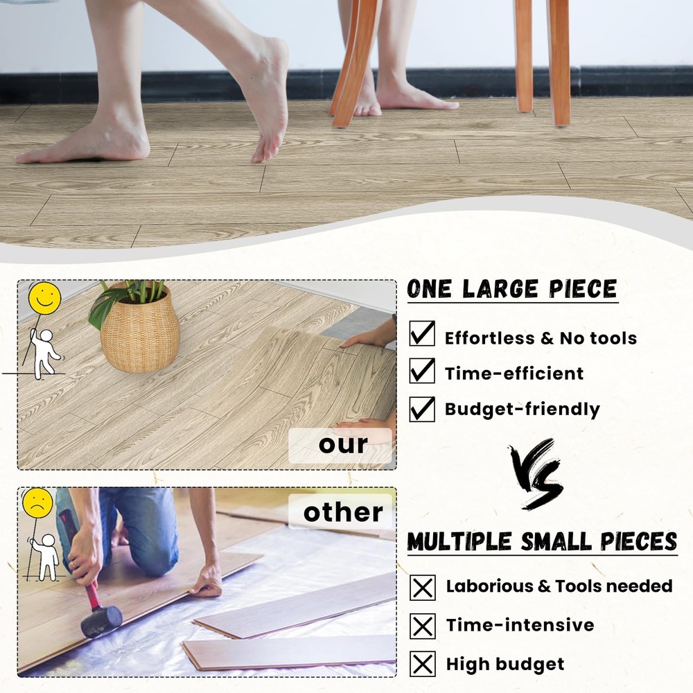 floor stickers are made of PVC materials that feature a slip-resistant, wear-resistant, and flame-retardant surface that is easy to clean and install. The water-resistant film allows for worry-free cleaning on various surfaces, including tiles, marble floors, wood floors, cement, and self-leveling floors. Ideal for any space, these stickers offer excellent sound insulation and heat preservation. Upgrade your floors with ease! 【Vinyl Flooring Roll】Our vinyl flooring is conveniently rolled up, providing significant advantages compared to traditional tile and strip floor stickers. It reduces material usage, seam requirements, and installation time, making it easier to handle, transport, and store. 【Quick and Easy Installation】Our peel and stick vinyl flooring is extremely easy to install and requires no special tools or adhesives. Simply peel off the backing and stick them onto any flat and clean surface. 【Waterproof and Wear-resistant 】Created with a precise 5-layer manufacturing process, our peel and stick floor tiles are designed to endure daily wear and tear. Not only are they waterproof, but they also resist dirt and damage. Cleaning them is effortless, just like maintaining a regular floor, so you can enjoy peace of mind. 【First Choice for Rental Houses】Our thin vinyl plank flooring is an ideal choice for rental homes, as it offers an economical and convenient way to remodel without damaging the existing flooring from adhesive. 【Attention】Please note that this vinyl flooring is thin, measuring just 0.3mm in thickness. Consider the thickness factor before making your purchase. While it may resemble contact paper, it features a special anti-wear layer for enhanced adhesion and durability on the floor surface.