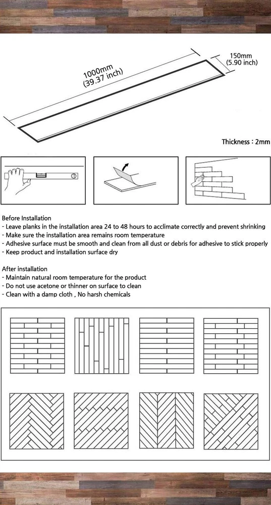 ■ Find ideas and inspiration for decorating home at or Magic-fix amazon brand store. ■ (ECK-USA) interior film sheets are well-being products aimed to assure our customer that it is safe to use our product in our daily lives. ■ The adhesive strength and quality of this product meet the technical standards of Korean public institutions. ■ Flame resistant products that have been approved by the Korea Fire Equipment Inspection Corporation and it deters the spread of fire during a fire and while suppressing the generation of toxic gases. ■ Please clean the adhesive side before the product adhesion. If the adhesive surface is not smooth, the wallpaper primer should be applied first. ■ Sometimes the backing paper may be partially separated. This is because it is subdivided into small rolls from large rolls. ■ Since the backing paper is removed when attaching, it does not interfere with the use of the product. ■ If you need more than amazon stock please contact us. ■ Since computer screens have chromatic aberration we can not guarantee that the color of our products will be exactly the same with the photographs. ■ DO NOT TAKE INTERNALLY - California PROP 65 WARNING : Cancer and Reproductive Harm - For more information , go to P65 Warnings ca gov. ■ This warning is required by the state of California to meet Proposition 65 requirements. Home Decoration & Design Ideas - Looking to update your old Floor? You will have the chance to restore old floor and create a new one ! Each Plank Size : 39.37 inch X 5.90 inch, Thickness 2.0mm (Extra Thick & Durable) , Material : High Quality Polyvinyl Chloride Feature : Durable & Easy to Clean , Realistic Texture , Waterproof , Excellent self-adhesive , Effortless Application Application : Home , school, restaurant, church, exhibition and other interior spaces Package : 5 planks , Coverage per Pack : 8 square feet