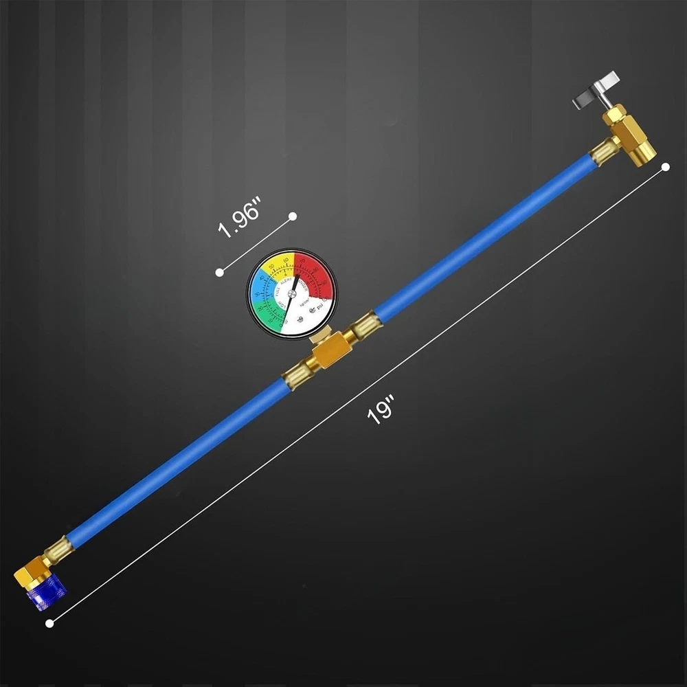 S elf-Sealing R134a A/C Can Tap Gauge Hose Recharge AC Conditioning Fast Shipping YOU MAY IN NEED OF IT In order to live comfortably in the hot summer, the air conditioning is essential. It is necessary to carry out routine maintenance of vehicle air conditioning before the summer comes, which requires the use of professional air conditioner maintenance tools. ADAFIRST AC U charge hose with gauge tool is one of the simple freon tool for AC diagnostic check and refrigerant charging work SET INCLUDES R134a Charging Hose with Gauge x 1 SPECIFICATION 1. Total length: 19" (the gauge is right in the middle). 2. Material: Rubber nylon resin hose and metal fittings. 3. Scale range: 0-100PSI, 0-7kg/cm². 4. Fittings: R134a low pressure side quick coupler and R134a self-piercing type can tap FITMENT TYPE Air conditioning: fit for all models with easy to reach R134a suction service port. Refrigerant can: Can with 1/2" male thread bottle opening, self-piercing type. EASY TO OPERATE Measure Pressure without R134a Can 1. Start the car, open AC to MAX. 2. Clockwise turn T type knob to close can tap. 3. Connect the quick coupler to the car AC suction service port to measure the pressure. Measure Pressure with R134a Can & Charge Refrigerant 1. Start the car, open AC to MAX. 2. Anticlockwise turn T type knob to retract the internal pin, screw the can tap on the R134a can. 3. Connect the quick coupler to the car AC suction service port, you can get the pressure index. 4. Clockwise turn T type knob to pierce R134a can, and then anticlockwise turn T type knob to retract the internal pin, to connect the R134a can and the AC system for charging refrigerant. 5. After charging, clockwise turn T type knob to close can tap, turn off the vehicle and the AC system. 6. Carefully disconnect the quick coupler from the AC system, the hoses may contain residual refrigerant. NOTE 1. This AC charging hose is 19" in total. If your AC suction service port is hard to reach, we do not recommend buying this product 2. Please confirm your AC system uses R134a refrigerant and refrigerant bottle opening is 1/2" ACME Male thread before biding. 3. Please wear gloves and goggles when use. 4. The AC refrigerant recharge tool should be used by professional or under the guidance of a professional. 5. Always refer to equipment manufacturer's operation instruction, compare to the manufacturer's recommended readings. 6. Please ensure the AC compressor is working when measure pressure. Otherwise you will get a wrong index.