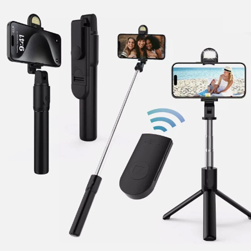 Extendable Selfie Stick Tripod with Detachable Wireless Remote and Tripod Stand Selfie Stick Compatible with All Cell Phone Compact Size & Lightweight Extendable & Foldable Selfie Stick for Cell Phone - This selfie stick tripod can be extended between 7.6 to 34 inches, suitable for Photograph, Facetime, Business and more. Compact design, take this selfie stick everywhere you go. Selfie Stick Tripod With Wireless Remote - 2-in-1 selfie stick tripod with built-in detachable wireless remote (max: 33ft). Allows you to take selfie or group photos like parties, graduation, wedding, travel. Use as regular selfie stick or tripod (Under tripod mode, the center of gravity of cellphone must be kept in line with the selfie stick. The lower the height of extendable rod, the better the stability) Widely Compatible Selfie Stick Tripods for Phone - Compatible with most 4.7 - 6.0 inches Smart Phone. Easy application and precise positioning to expand the range of shots you can capture. Adjustable Phone Holder Tripod and Selfie Stick - 230° rotation head. Use in horizontal camera mode to get the best angle photos. Lightweight & Premium Aluminum Alloy - Comfortable handle and aluminum alloy material selfie stick tripod, not only light but also corrosion resistant. Specifications Material: ABS+stainless steel Suitable for: Cameras, mobile phones Equipment weight: About 130g Product size: 7.68*1.38*1.57in Bluetooth version: Bluetooth 4.0 Bluetooth transmission distance: 10M Support Phone size: 4.7 - 6.0 inches User Manual: 1. Press and hold the remote control button to turn on the remote control blue light flashes. 2. Turn on the phone Bluetooth, search for the new device "SelfieCom", and then connect. 3. After the pairing and connection is completed, open the mobile phone camera software. 4. Set the pose Press the remote control shutter to control the photo. Package Includes 1x Retail packaging 1x Selfie Stick Tripod 1x Detachable Bluetooth Remote(Included battery CR1632) 1x User Manual