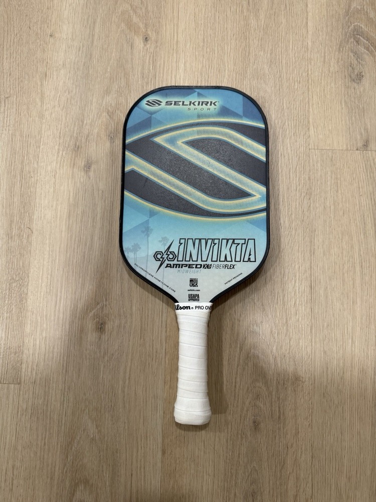 The Selkirk Invikta Amped X5 Fiberflex pickleball paddle in black and blue color is a midweight option designed for players looking for a balance of power and control on the court. Made in the United States, this paddle features a Fiberflex face for enhanced spin and durability, providing players with a reliable and consistent performance during gameplay. With the Selkirk brand known for producing high-quality pickleball equipment, the Invikta model is a popular choice among players looking to elevate their game.