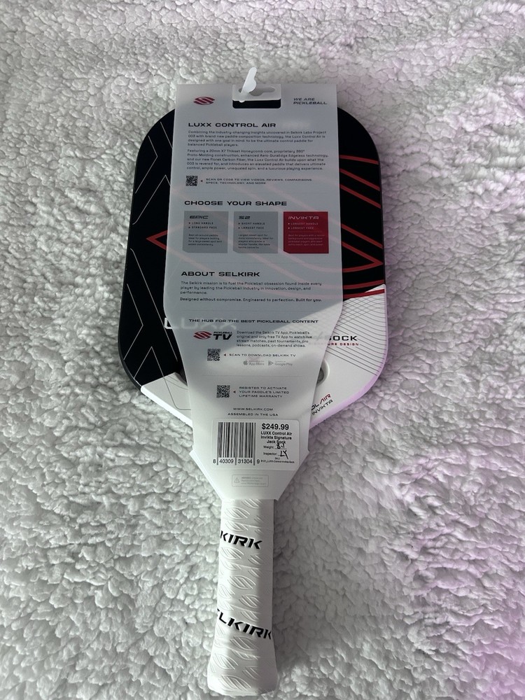 BRAND NEW Selkirk Luxx Control Pickleball Paddle is a high-quality, carbon fiber paddle designed for ultimate control on the pickleball court. The brand, Selkirk, is known for producing durable and reliable sporting goods for racquet sports like tennis and pickleball. With its sleek design and advanced technology, this paddle offers players a competitive edge in their game, making it a popular choice among serious pickleball enthusiasts looking to enhance their performance. The Florek carbon fiber pad provides excellent weight distribution and stability, making it a top choice for players looking for precision and power in their shots. Sells for $250.00 on Selkirk. ON SALE $50 OFF