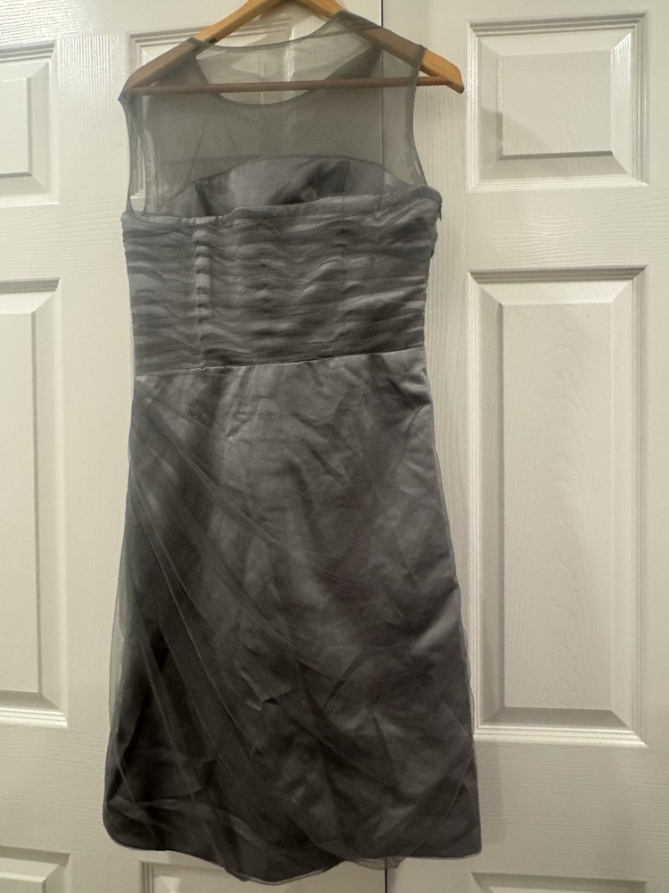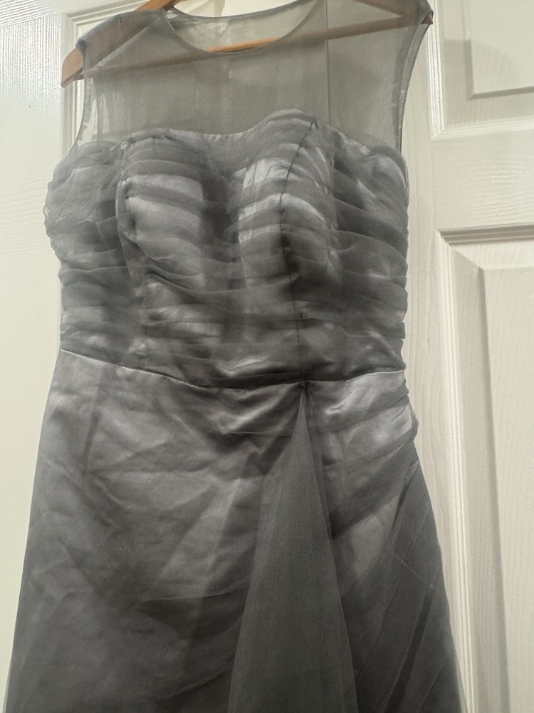 This semi-formal dress in size M features a solid gray silver color with a V-neckline and short strappy sleeves. The dress is made of polyester tulle fabric with pleated and layered accents, giving it a unique and elegant look. The knee-length dress has a zip closure and is designed for formal occasions, making it suitable for various seasons such as winter, summer, fall, and spring. The dress is lined, collarless, ruched, and sheer, with a metallic theme that adds a touch of sophistication to any ensemble. Easy fix. Otherwise no wear on dress.