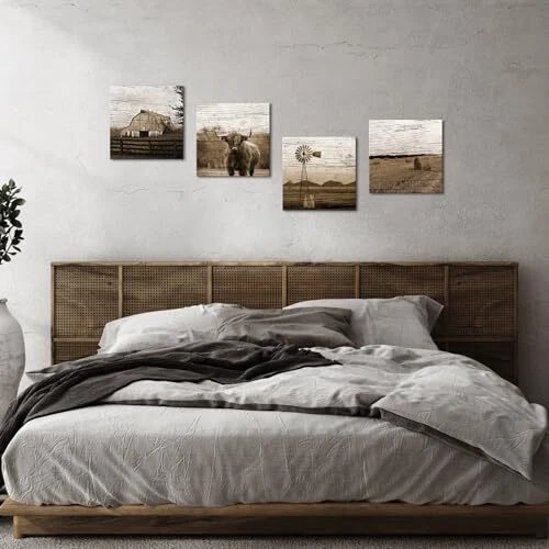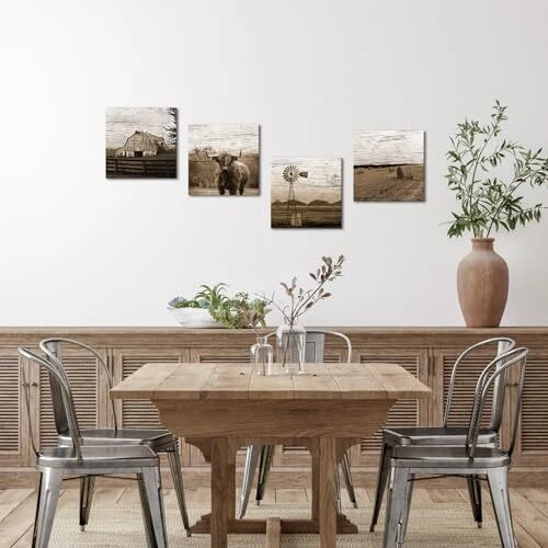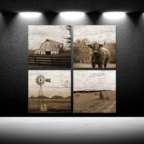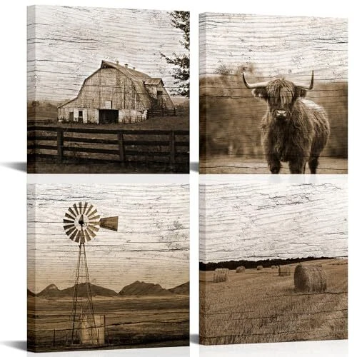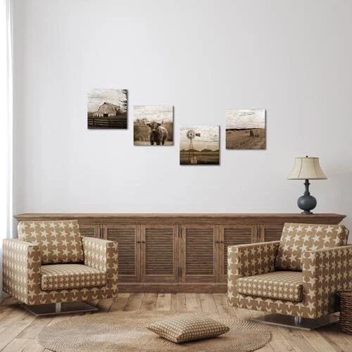 Menu 1. We require immediate payment. 2. We currently accept payment via eBay managed payments only. 3. Once payment is cleared, we will dispatch your shipment within 1-3 business days. Please refer to the "Shipping" tab for more information regarding shipping speed to your destination. Sepia Farmhouse Canvas Wall Art 4 Piece Set Highland Cow, Barn, Windmill, Straw Bales Pictures Vintage Longhorn Cattle Giclee Prints for Living Room Decor 12x12 Inches Each Product description Rustic Farmhouse Aesthetic: This set of four sepia-toned canvas prints captures the essence of farmhouse life, featuring highland cows, barns, windmills, and straw bales, perfect for adding a touch of rustic charm to your living space. Versatile Wall Decor: Each canvas in this 12x12 inch set offers a unique glimpse into country living, making them ideal for diverse settings like living rooms, kitchens, or farmhouse-themed spaces. High-Quality Detailing: Experience the intricate details and rich sepia hues in each print, depicting longhorn cattle and rustic farm scenes with clarity and precision, bringing a vintage feel to any room. Ready to Hang: Simplify your decorating process with these easy-to-hang artworks, complete with mounting hardware, perfect for creating a cohesive look in your home. Durable and Timeless: Crafted for longevity, these canvas prints are not just visually appealing but are made to last, ensuring that your home enjoys a lasting touch of farmhouse elegance. PLEASE MESSAGE US IF YOU HAVE ANY OTHER QUESTIONS, AND MANY THANKS FOR READING ALL OF THIS. Copyright ©#. All Rights Reserved.