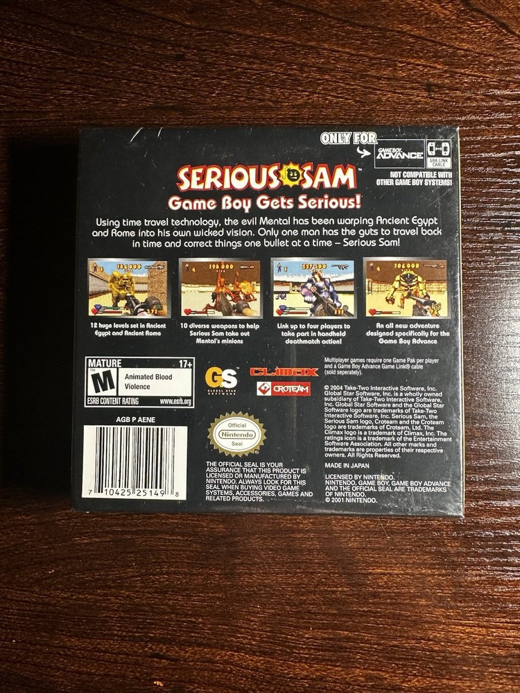 Release Year:2004Region Code:NTSC-U/C (US/Canada)Genre:ShooterRating:M - Maturegtin13:0710425251498UPC:0710425251498Publisher:Gotham GamesCountry of Origin:JapanPlatform:Nintendo Game Boy AdvanceGame Name:Serious Sam AdvanceVideo Game Series:Serious Sam Series