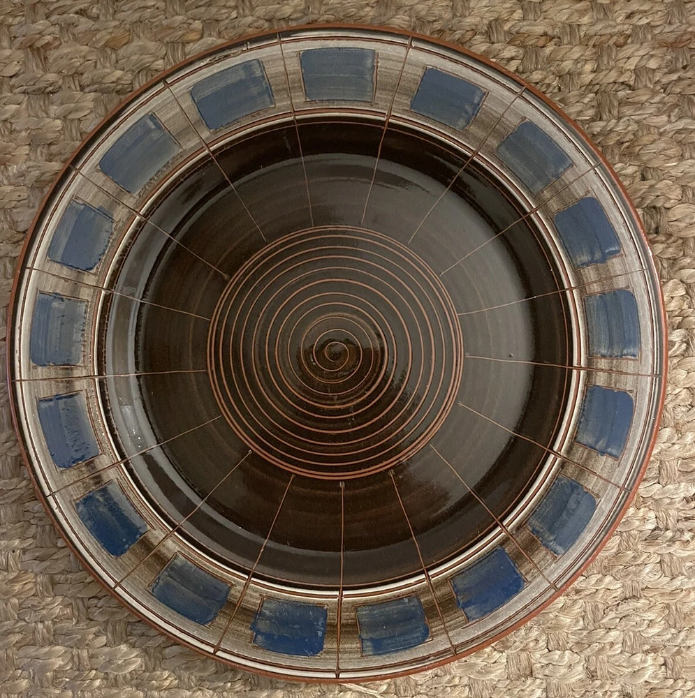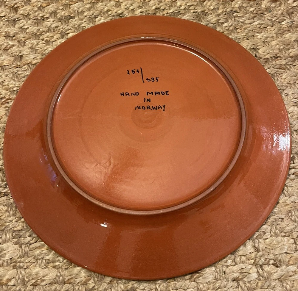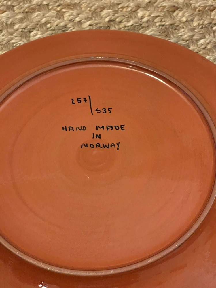 This beautiful ceramic platter is a stunning example of Scandinavian art pottery. With a round shape and all-over brown pattern, it's perfect for serving up your favorite dishes in style. Measuring at 12.5 inches in diameter, this limited edition piece was hand-crafted in Norway and features a glossy finish. The mid-century modern theme and style make it a unique addition to any collection, while being handmade makes even more special. Handmade with care instructions to hand wash only, this platter is a must-have for any pottery enthusiast. It’s a beautiful piece that you can tell has been made with love for their craft. Thanks for looking! :)