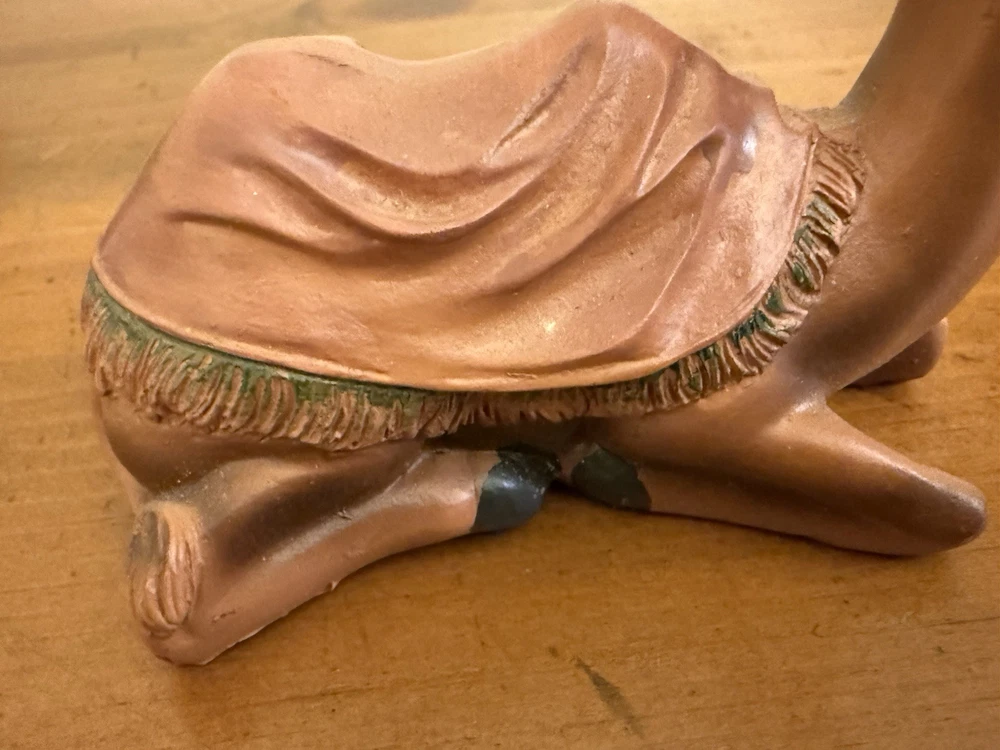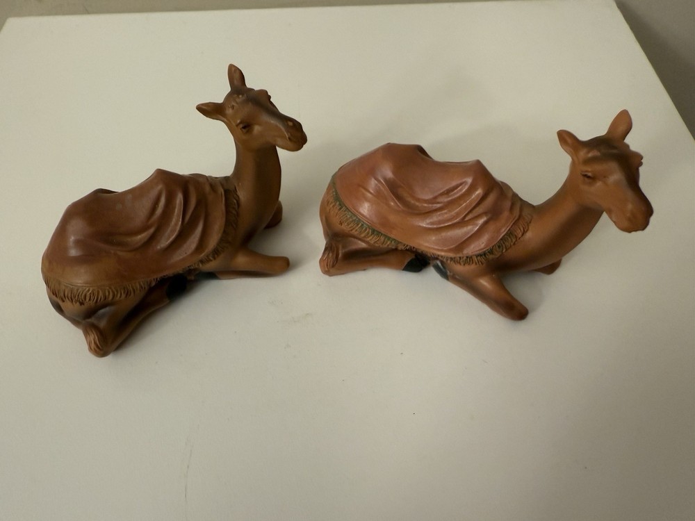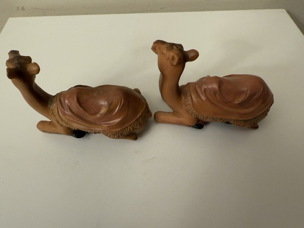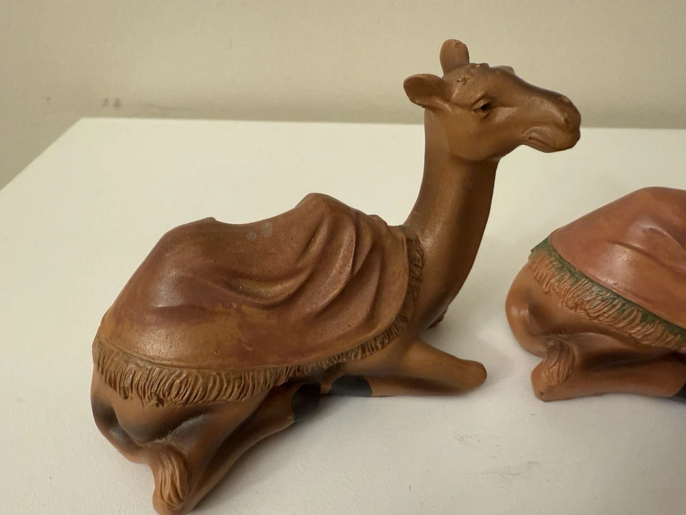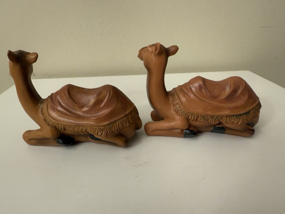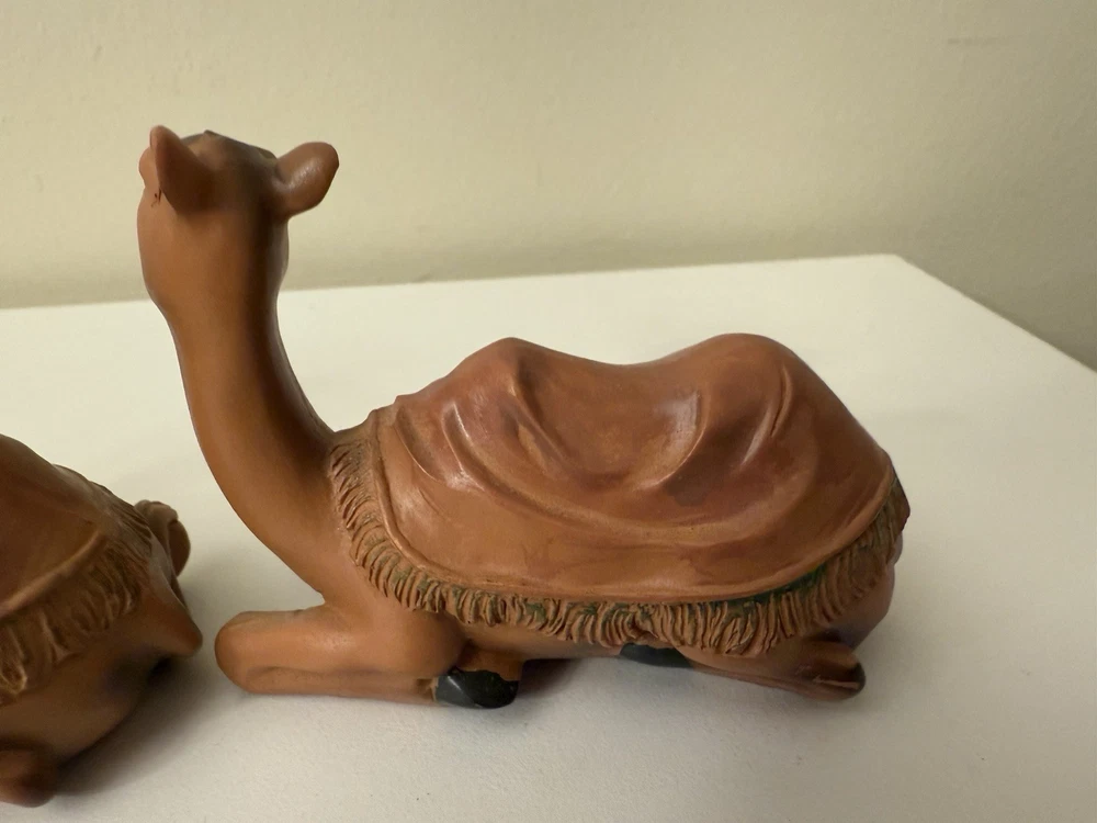 Set Of 2 Camels Laying Down Brown Green fringe Blanket Plastic Resin Replacement Good condition refer to pictures Seems to be made of hard plastic/poly resin possibly