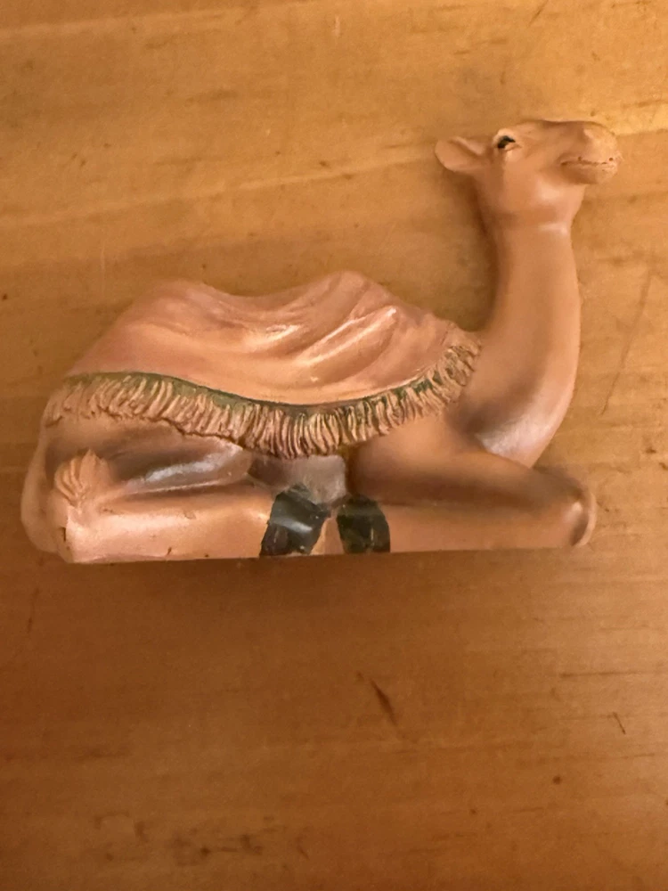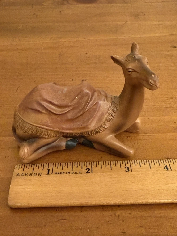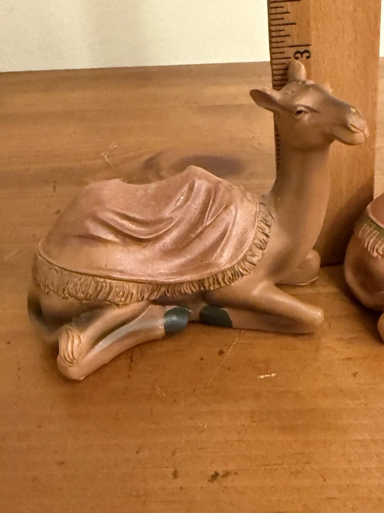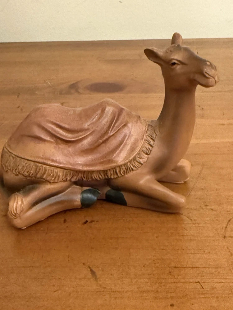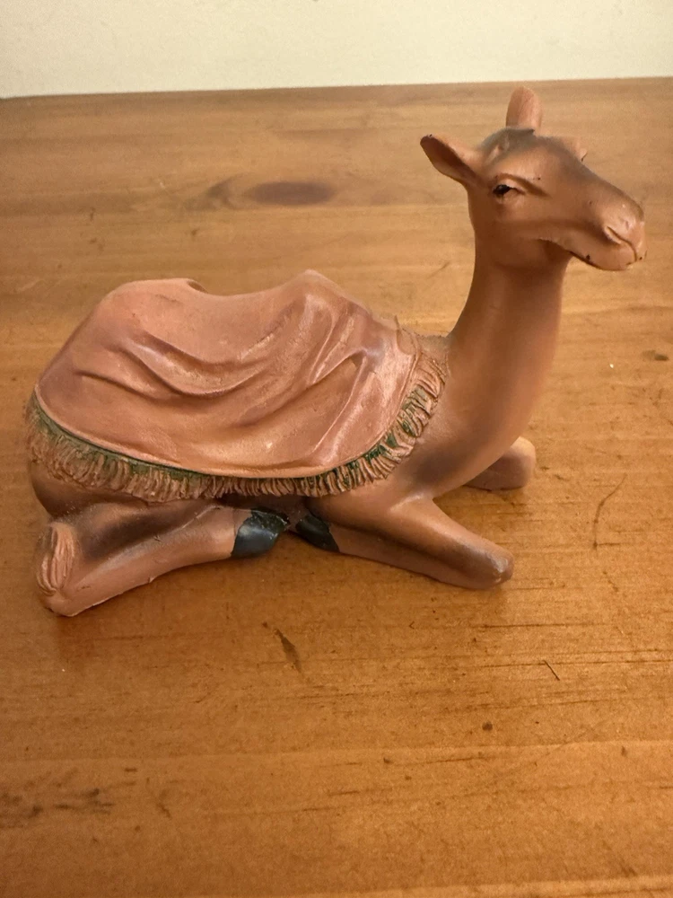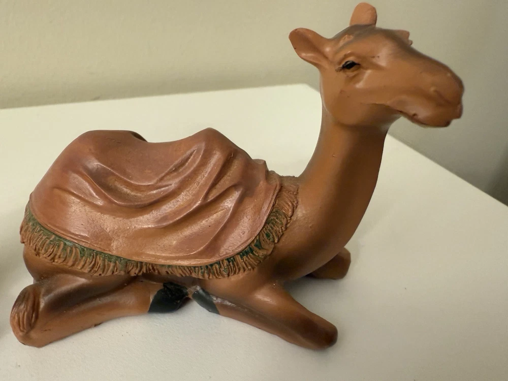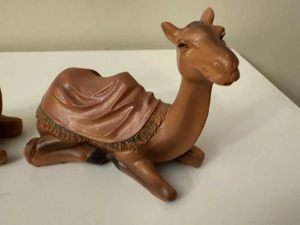 Set Of 2 Camels Laying Down Brown Green fringe Blanket Plastic Resin Replacement Good condition refer to pictures Seems to be made of hard plastic/poly resin possibly