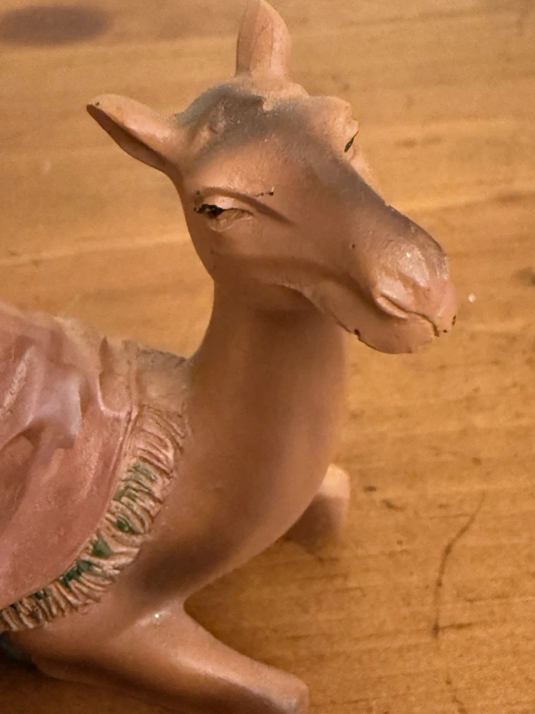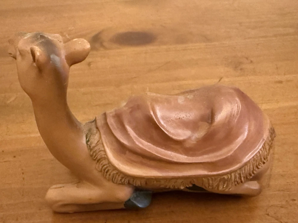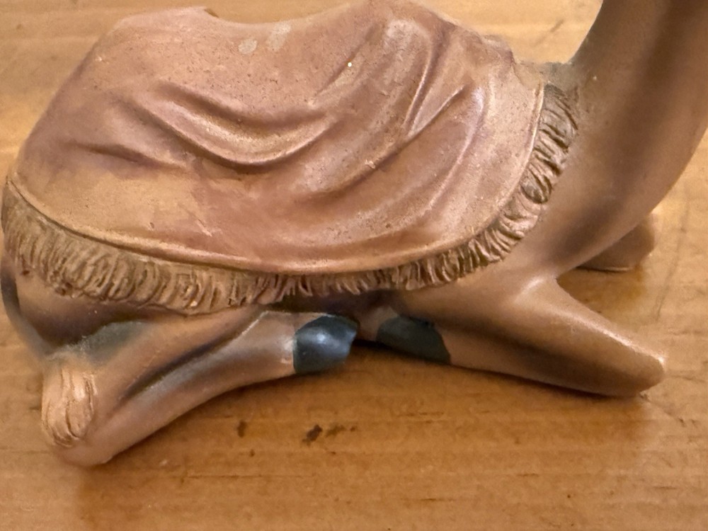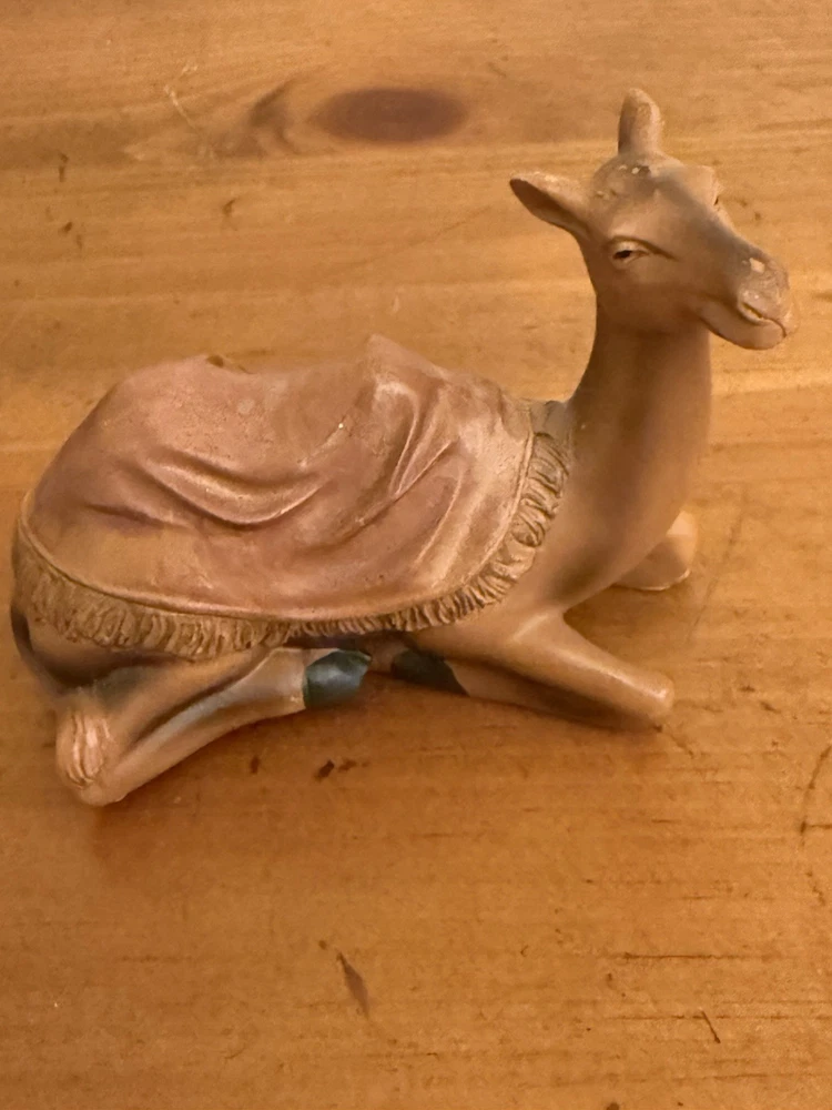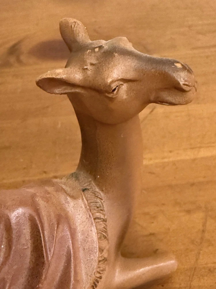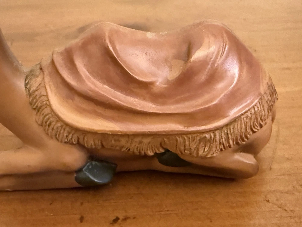 Set Of 2 Camels Laying Down Brown Green fringe Blanket Plastic Resin Replacement Good condition refer to pictures Seems to be made of hard plastic/poly resin possibly