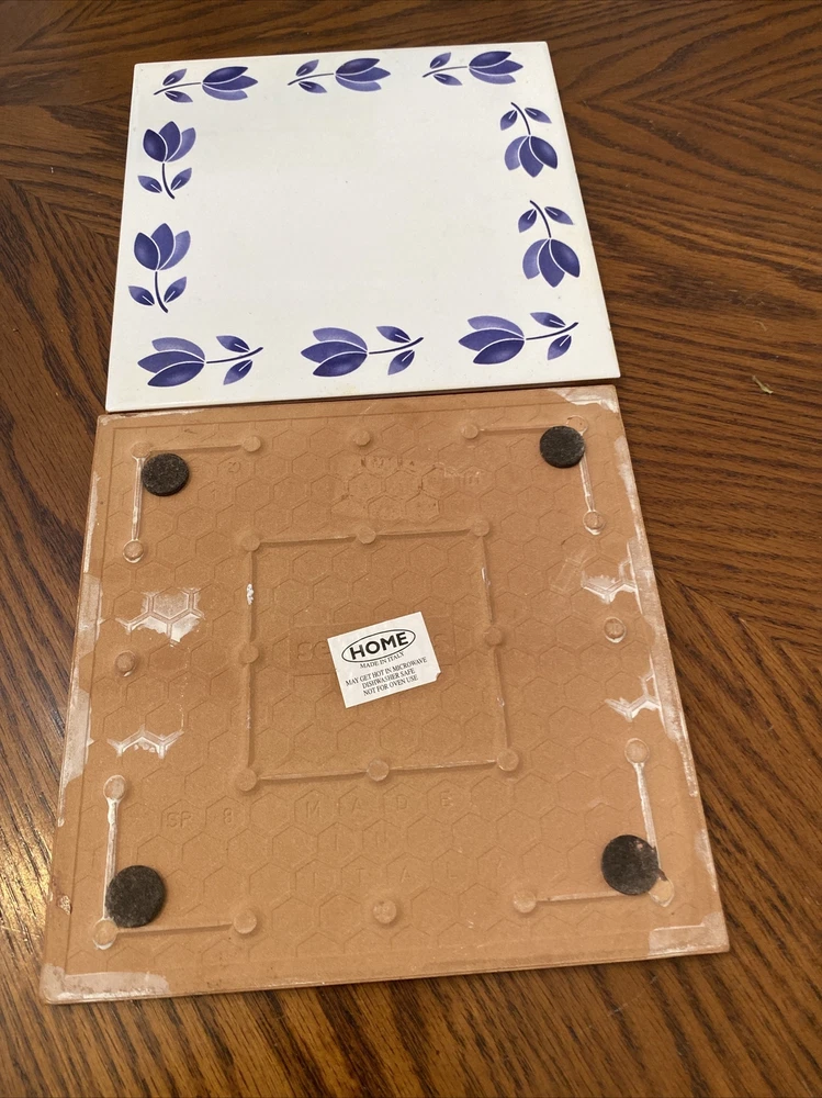 This set of two Italian tulip trivets in blue and white is perfect for protecting your countertops and tables from hot pots and pans. The ceramic material ensures durability and long-lasting use, while the glossy finish adds a touch of elegance to your kitchen. Designed as a practical and stylish addition to your kitchen, these trivets are ideal for holding hot dishes and plates during meal times. Their vibrant blue color adds a pop of color to your kitchen decor, and their unique tulip design is sure to make a statement. Perfect for anyone who loves to cook and entertain, these trivets are a must-have for any home. Trivets in great condition and ready for use. Measurements 8”x8” Thanks for looking and have a great day!!