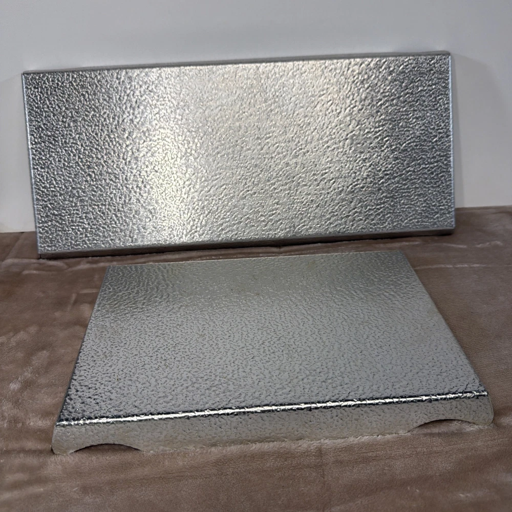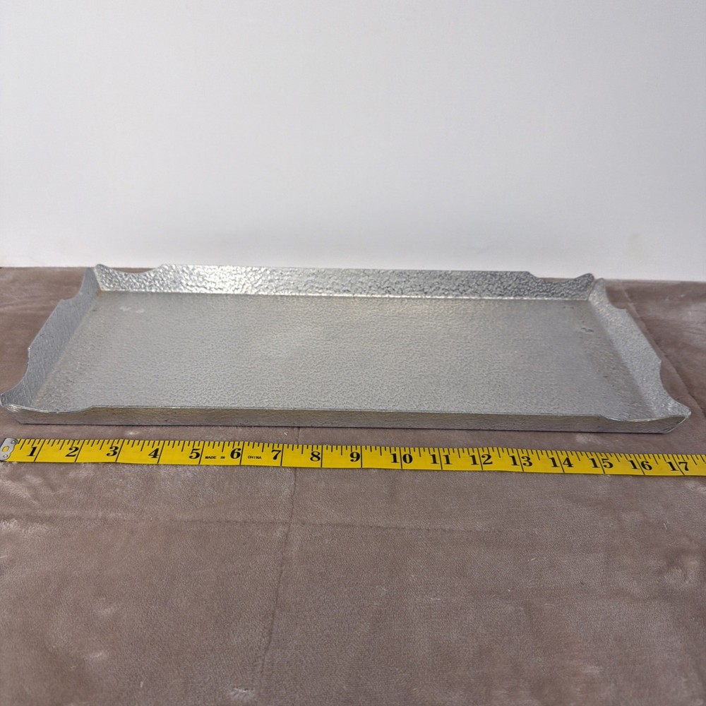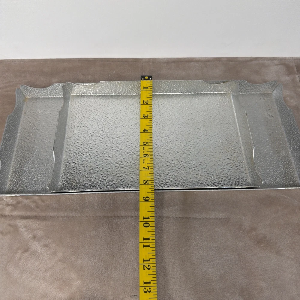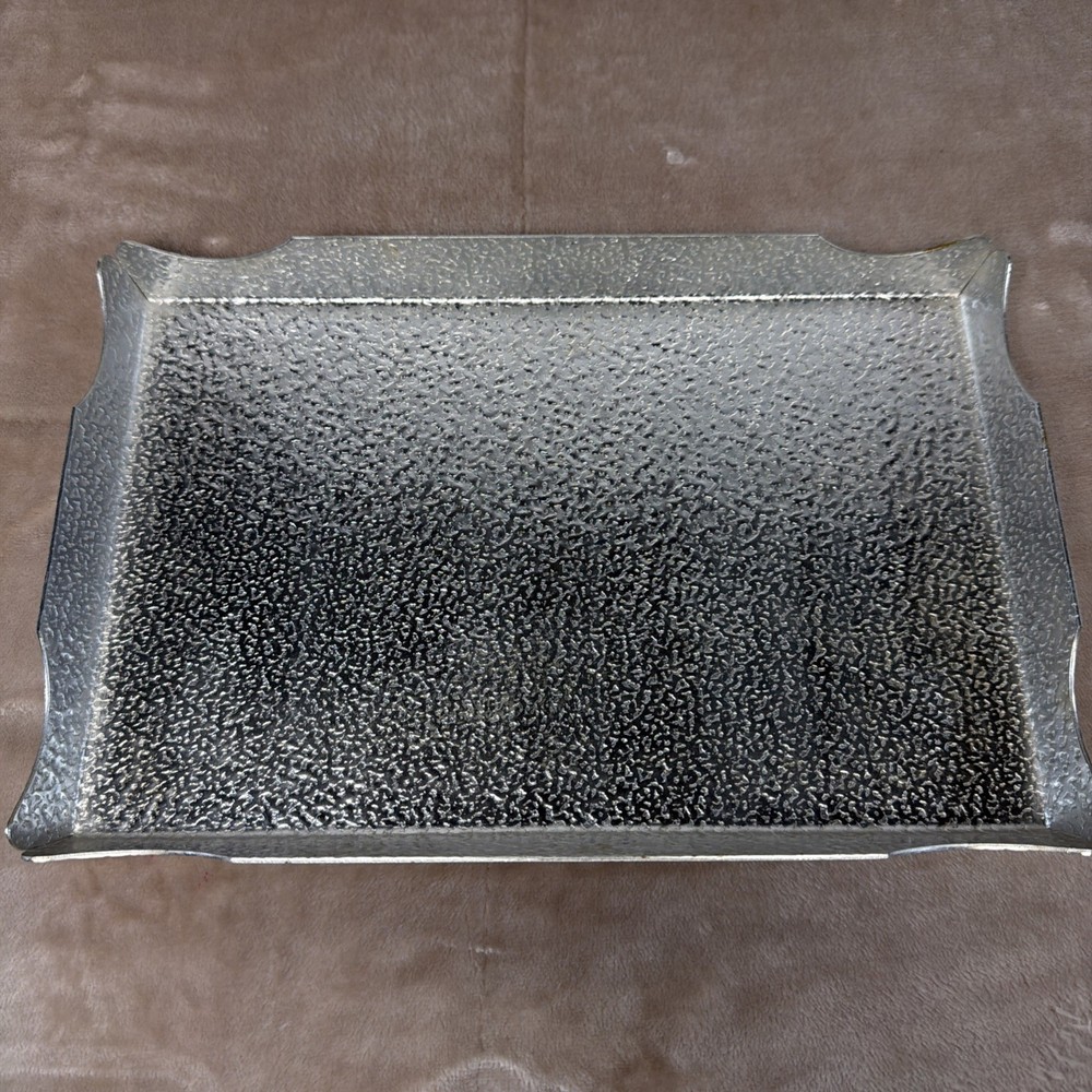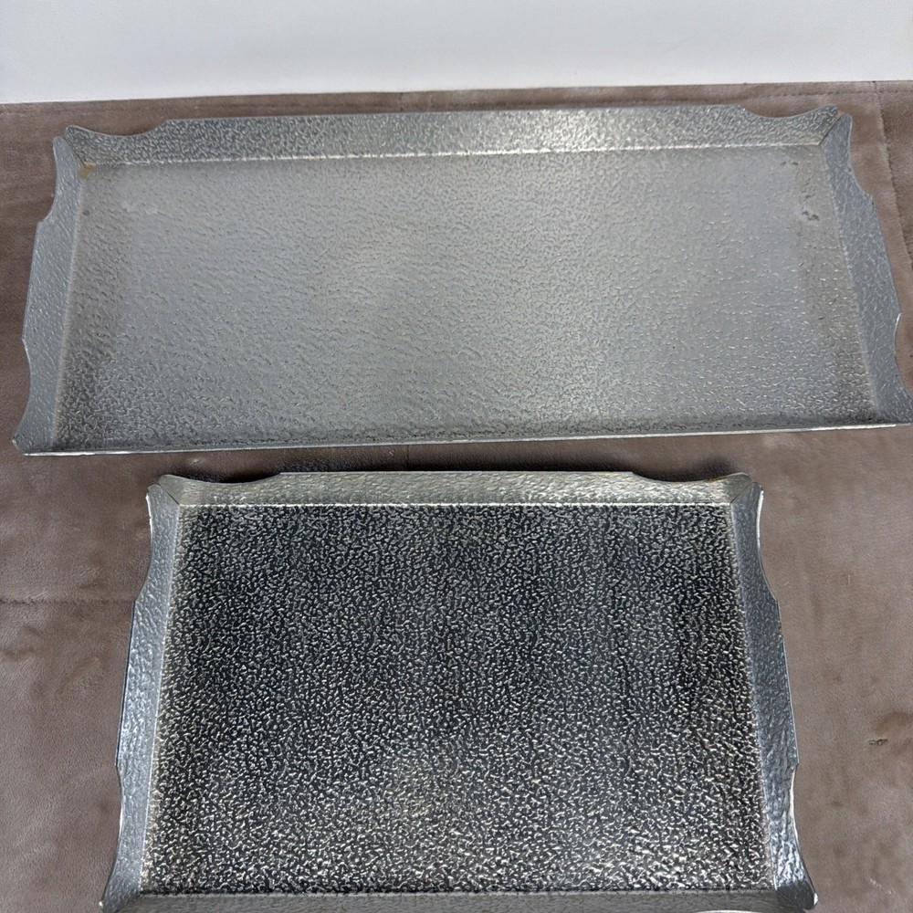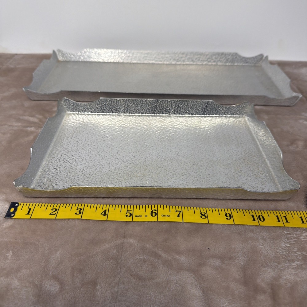 This set of 2 vintage metal serving trays features a rectangular hammered silver finish, adding a touch of elegance to any occasion. The small size and single compartment make them versatile for all occasions. Crafted from aluminum and metal, these original and vintage trays are perfect for serving or displaying items in your kitchen or home. Hand wash only to maintain their beauty, these trays are a unique addition to any collection.
