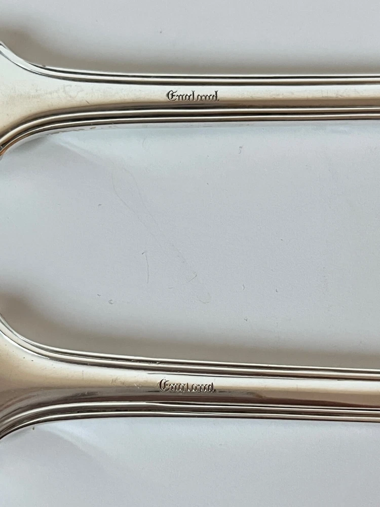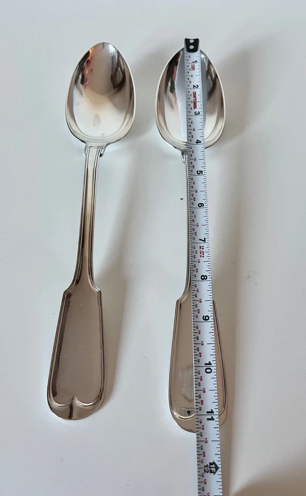 Set of 2 vintage silver plated serving spoons 11-1/4 inches long marked England, In good used condition and recently polished Please contact me if you have any questions or need more photos. Thank you