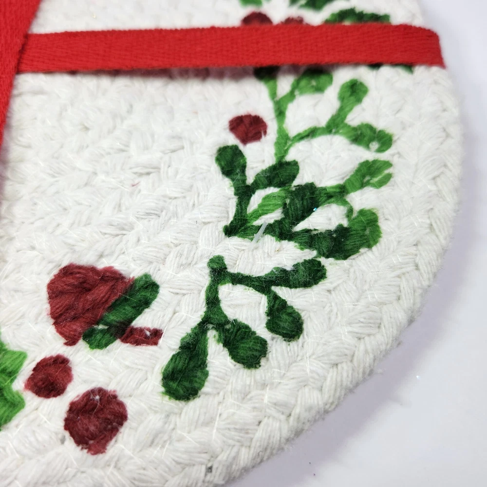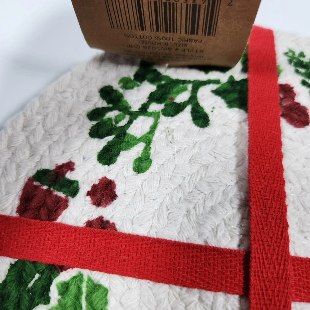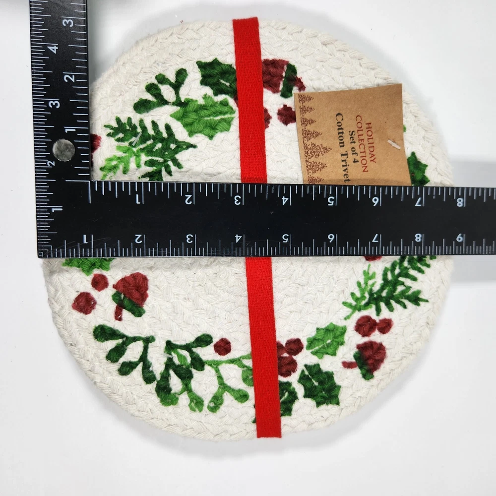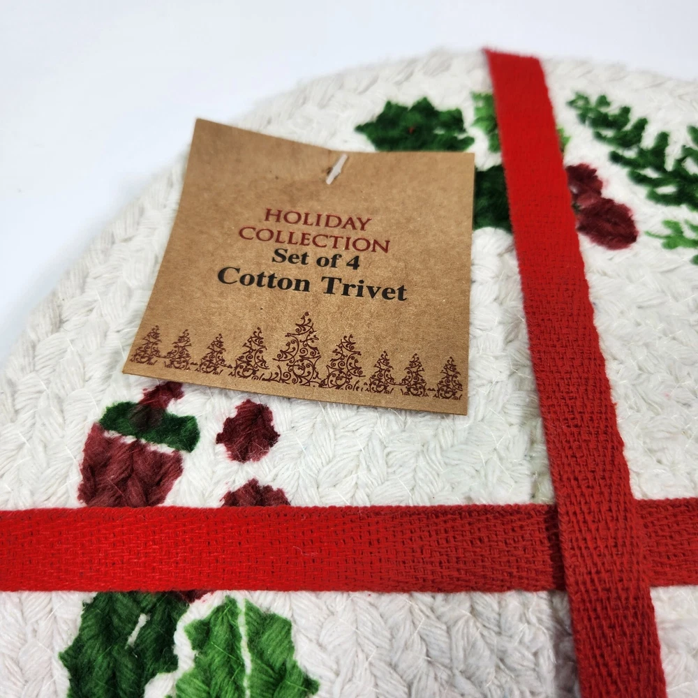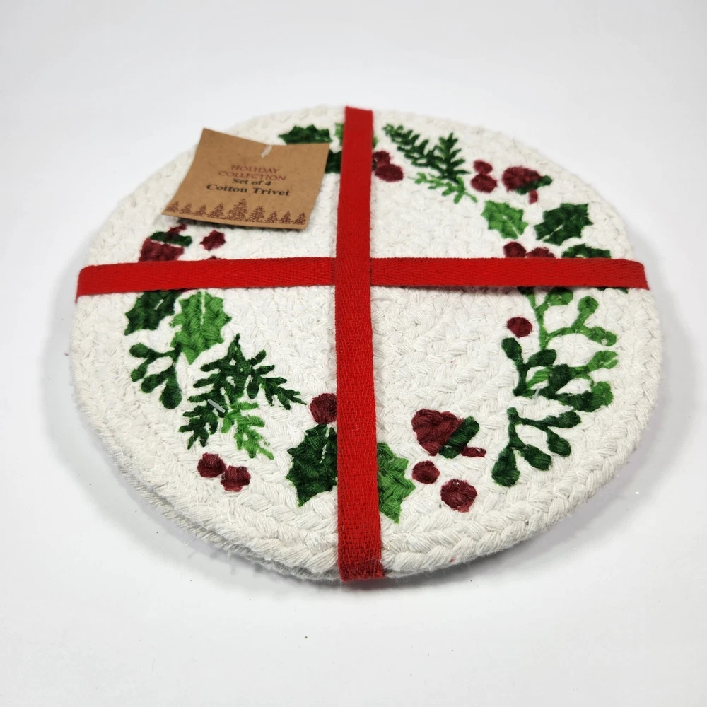 Set Of 4 Cotton Trivet Holiday Collection Braided 100% Cotton Christmas Accent Table Decor Color: White, green, red Dimension: approx 9" diameter NEW with tag. Please see photos for your reference as they are also part of the description. This is the actual item that you will receive. We take great care in packing our items for shipping so they will reach you safely. Please check out our other listings. We offer combined shipping for multiple purchases. Buyer may choose between economy and expedited shipping options. We use calculated shipping based on actual weight and dimensions of the package. We do not charge the buyer extra fees. Contact us for your questions before you purchase. Thank you! 28-240122-B133