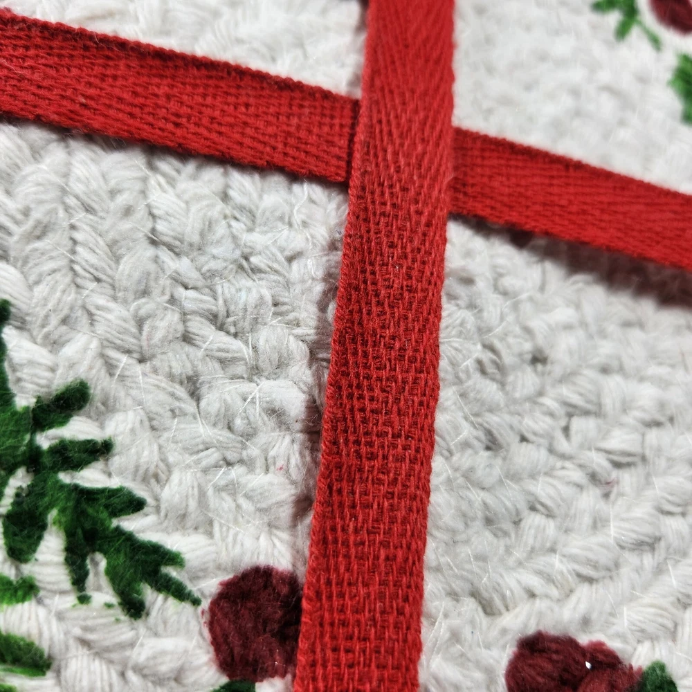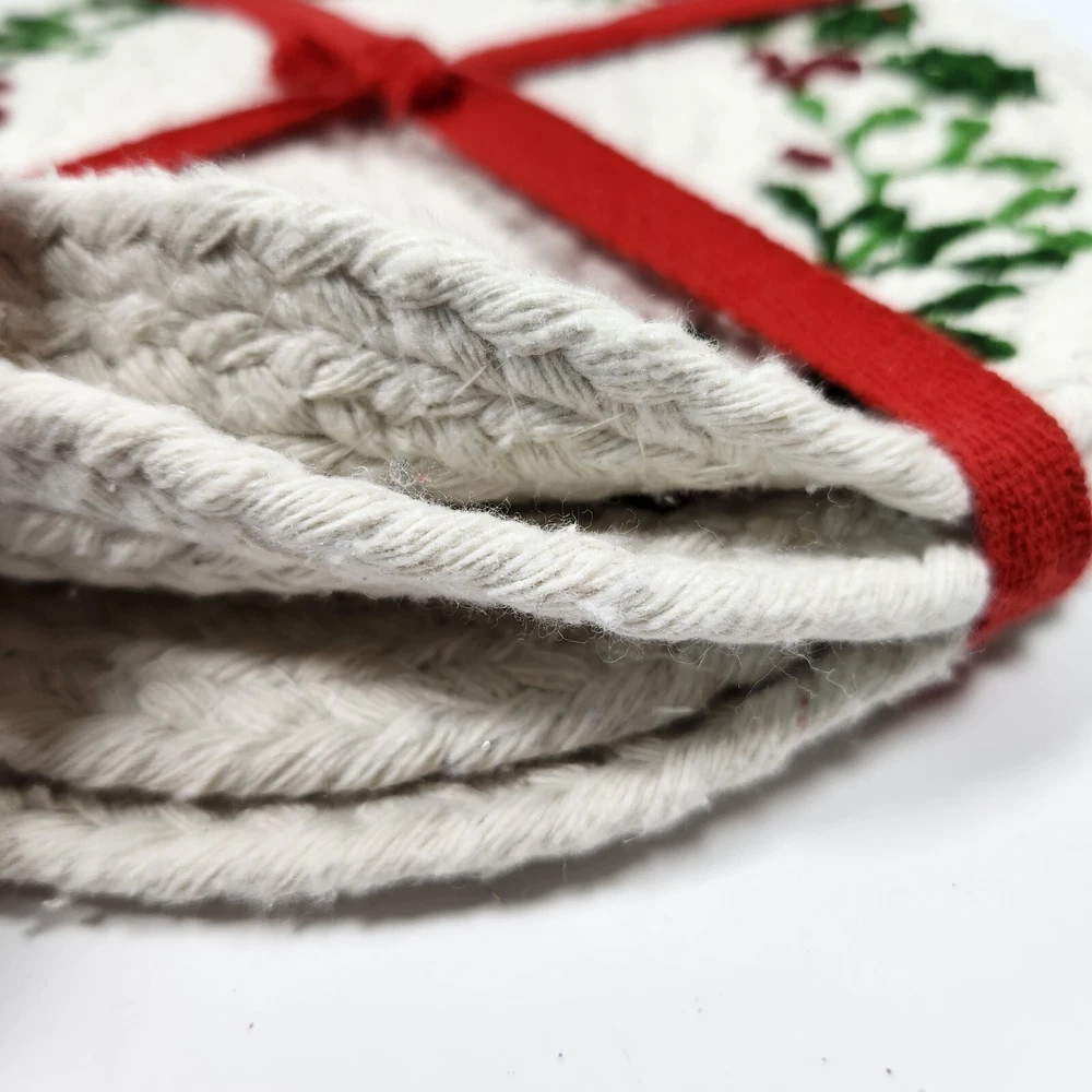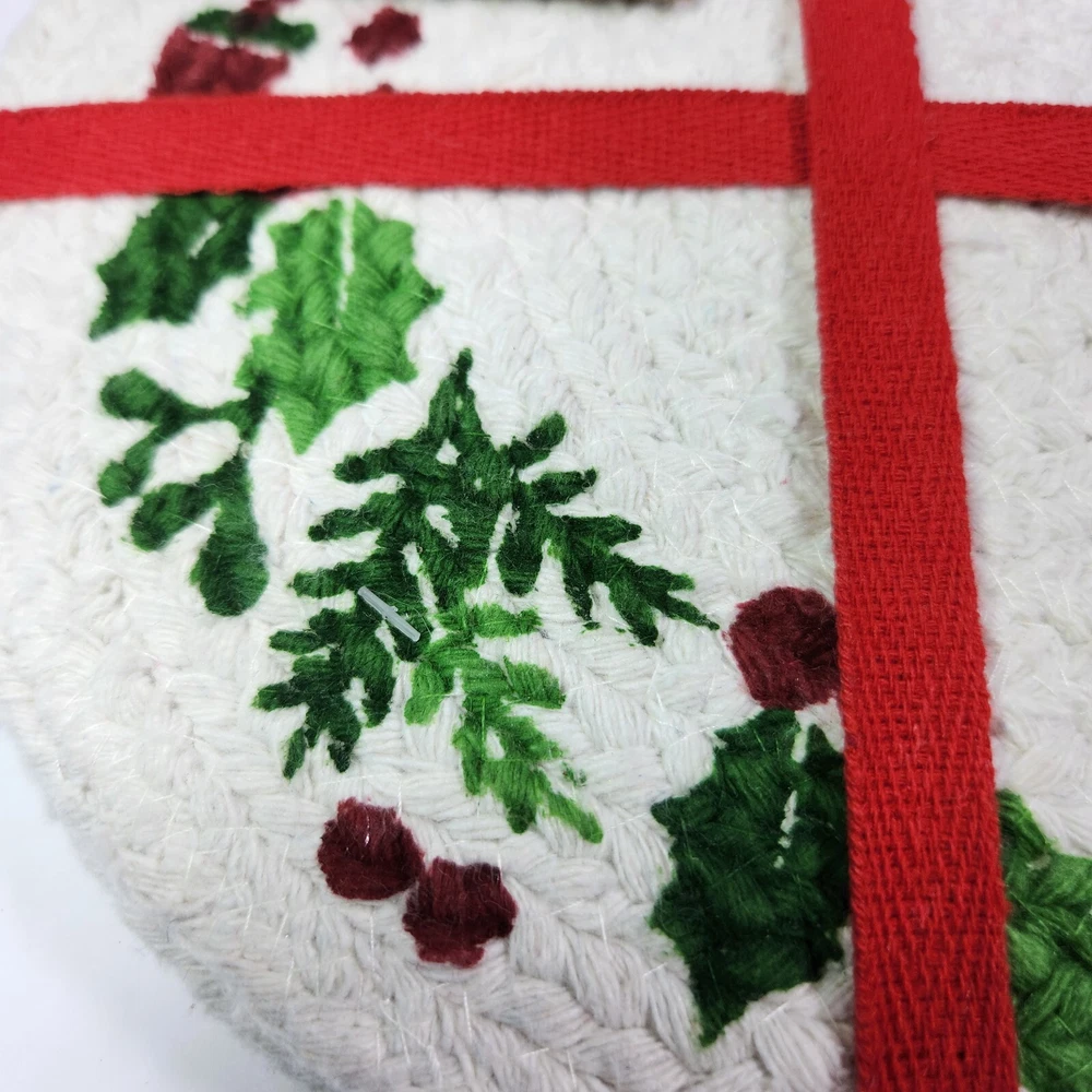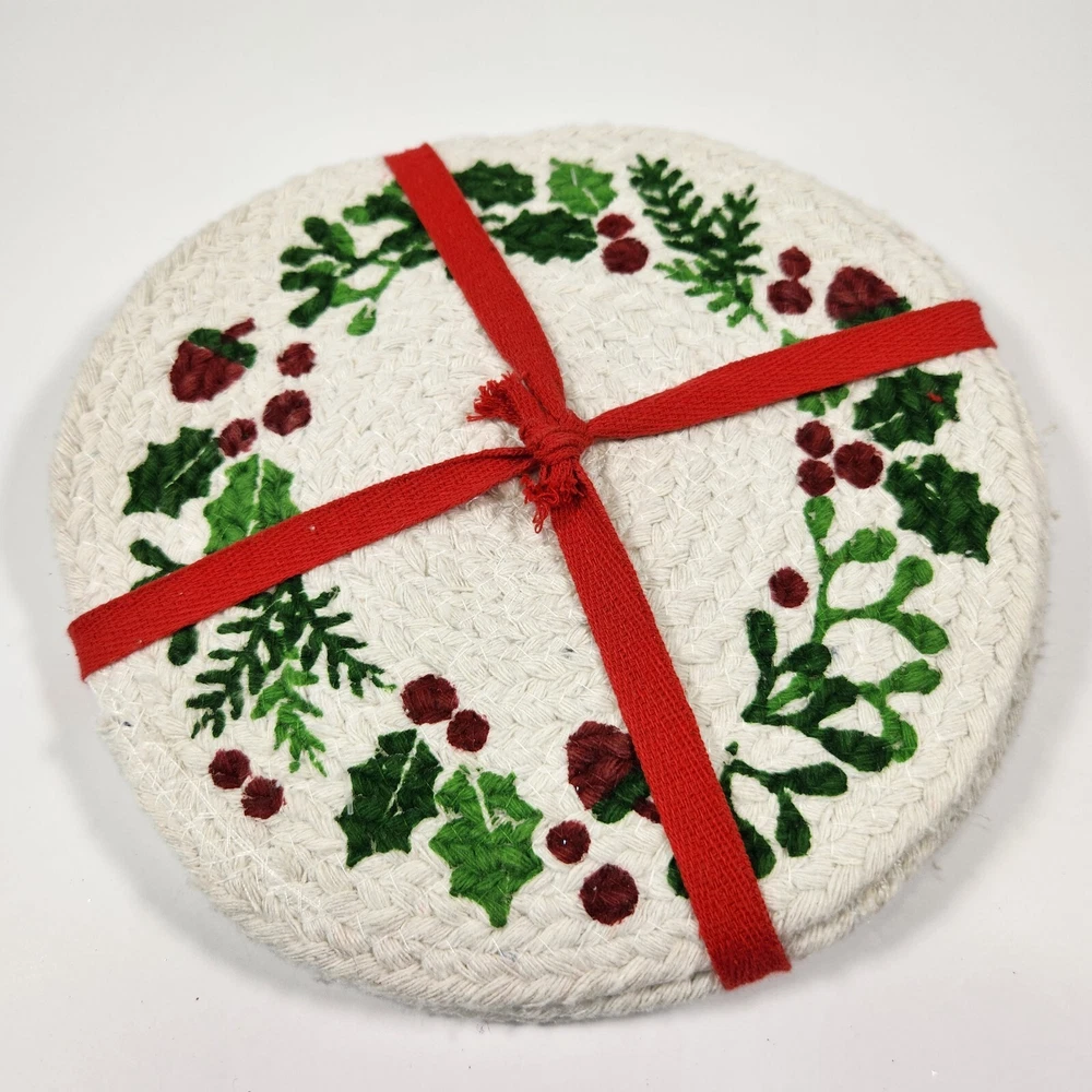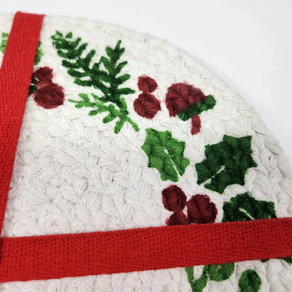 Set Of 4 Cotton Trivet Holiday Collection Braided 100% Cotton Christmas Accent Table Decor Color: White, green, red Dimension: approx 9" diameter NEW with tag. Please see photos for your reference as they are also part of the description. This is the actual item that you will receive. We take great care in packing our items for shipping so they will reach you safely. Please check out our other listings. We offer combined shipping for multiple purchases. Buyer may choose between economy and expedited shipping options. We use calculated shipping based on actual weight and dimensions of the package. We do not charge the buyer extra fees. Contact us for your questions before you purchase. Thank you! 28-240122-B133