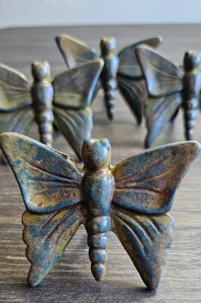 You'll love this unique set of 4 butterfly napkin rings. Super sturdy. Oxidation on metal makes their look even better! 2" tall. 3" wide. Weight 8oz.