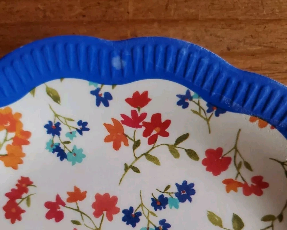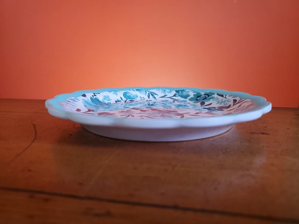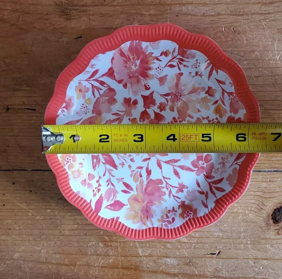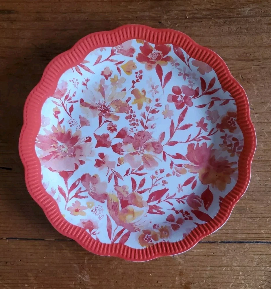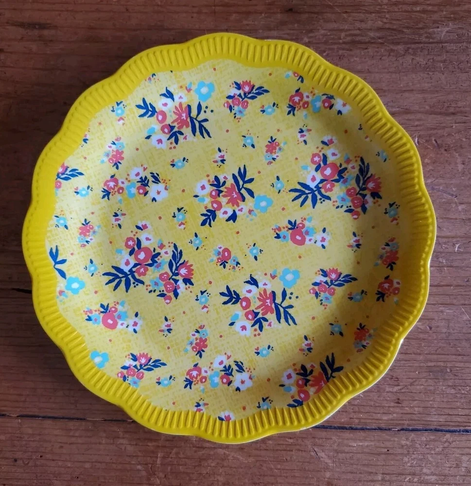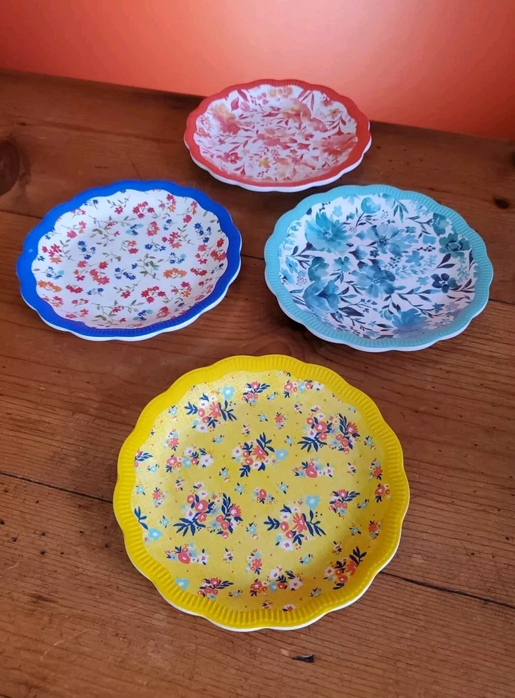 Set of 4 Pioneer Woman Colorful Floral Melamine Appetizer/Salad Plates 6 1/2" Melamine Dessert/Appetizer/Cake plates Scalloped edges In very good pre-owned condition Blue plate has a white blemish on its outer edge (see pictures) Thanks for looking Reach out with any questions you might have Lot 53