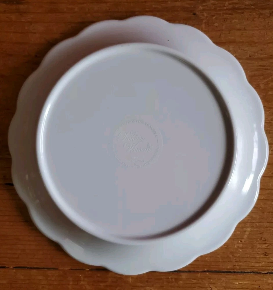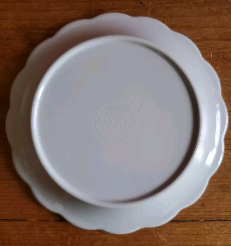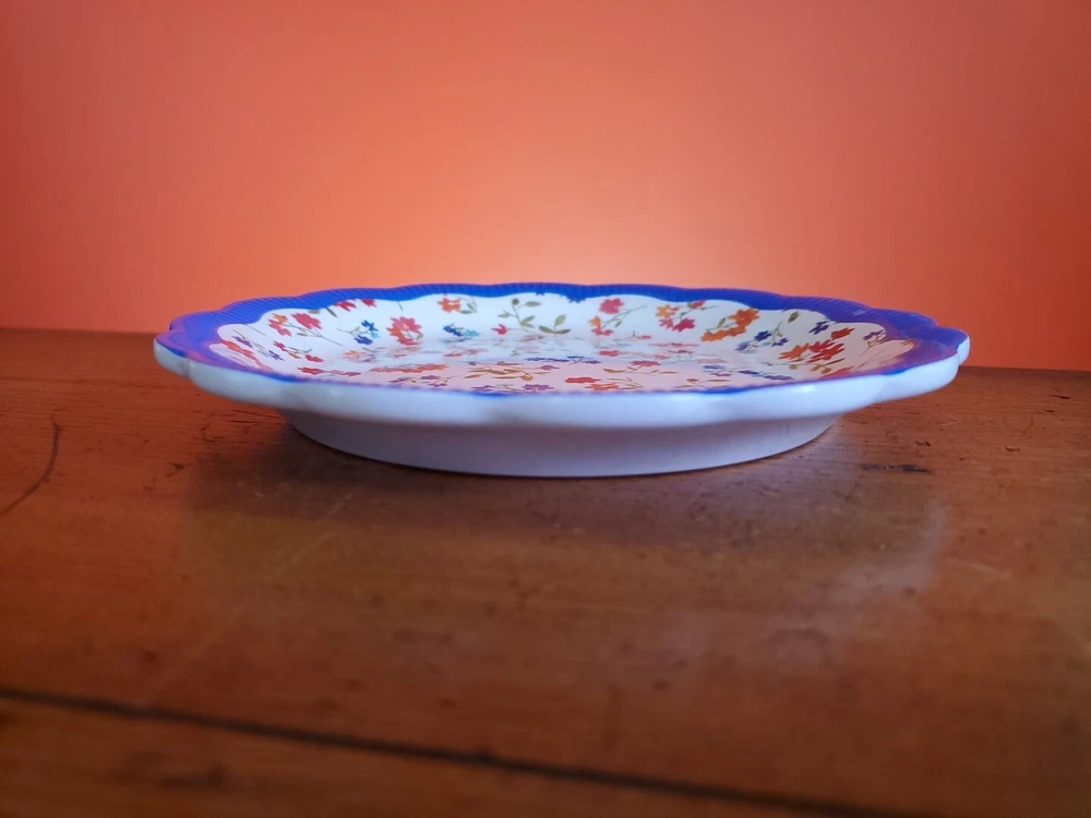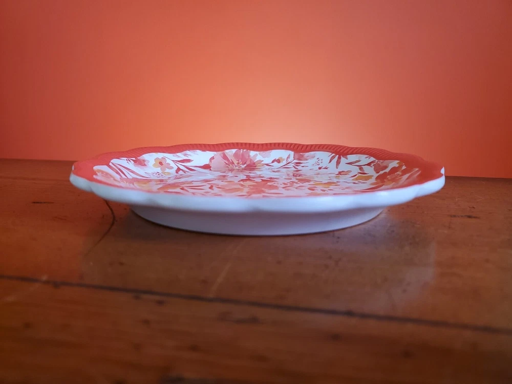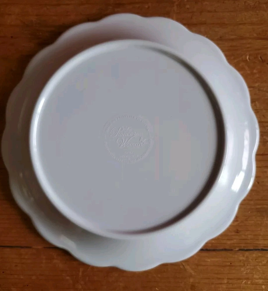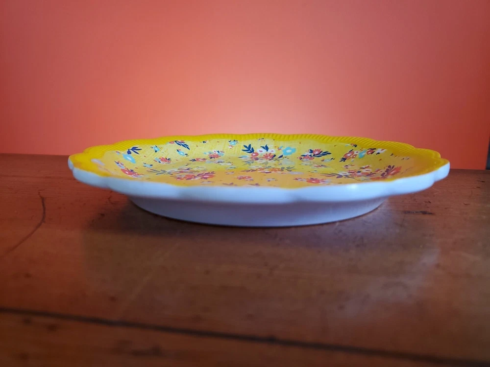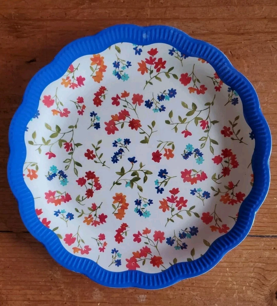 Set of 4 Pioneer Woman Colorful Floral Melamine Appetizer/Salad Plates 6 1/2" Melamine Dessert/Appetizer/Cake plates Scalloped edges In very good pre-owned condition Blue plate has a white blemish on its outer edge (see pictures) Thanks for looking Reach out with any questions you might have Lot 53