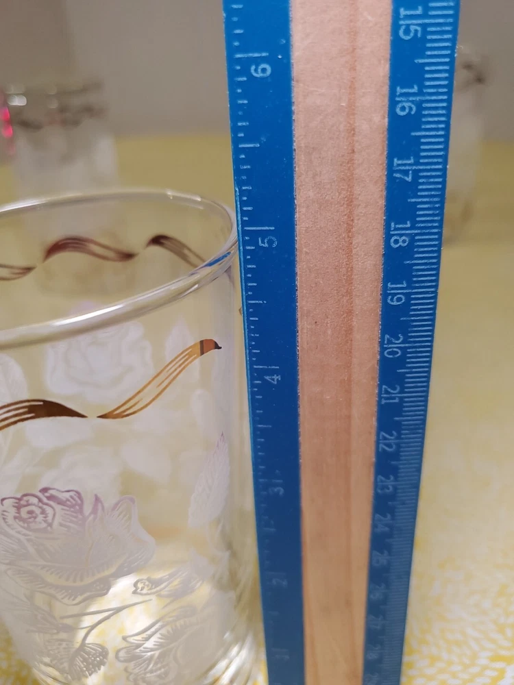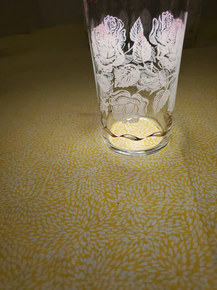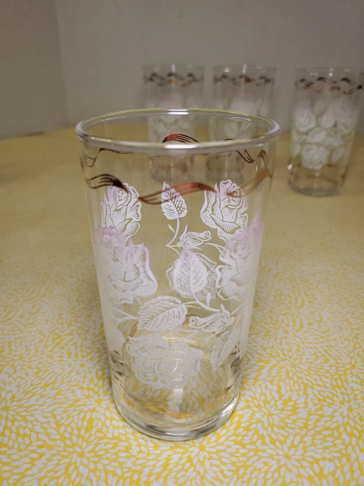 THANK YOU FOR VISITING OUR STORE. WE SHIP 6 DAYS A WEEK (UNLESS THERE IS A FEDERAL HOLIDAY). MOST ITEMS WILL SHIP IN A STURDY BOX AS NEEDED. PLEASE FEEL FREE TO REACH OUT IF YOU HAVE ANY QUESTIONS. WE WILL COMBINE SHIPPING WHEN AVAILABLE. Add a touch of Mid-Century Modern charm to your drinkware collection with this set of four vintage Libbey glass tumblers. Featuring a beautiful white rose leaf design with gold ribbon detailing, these glasses are perfect for any occasion from birthdays to anniversaries. With a capacity of 10-15 oz., they are ideal for both casual and formal occasions. Crafted in Ohio in 1960, these glasses are a true vintage original. The round shape, etched and decorated features, and glossy finish make them a stunning addition to any bar or kitchen. Hand wash only and measuring 6.5 inches in height, these glasses are a must-have for any collector of art glass.