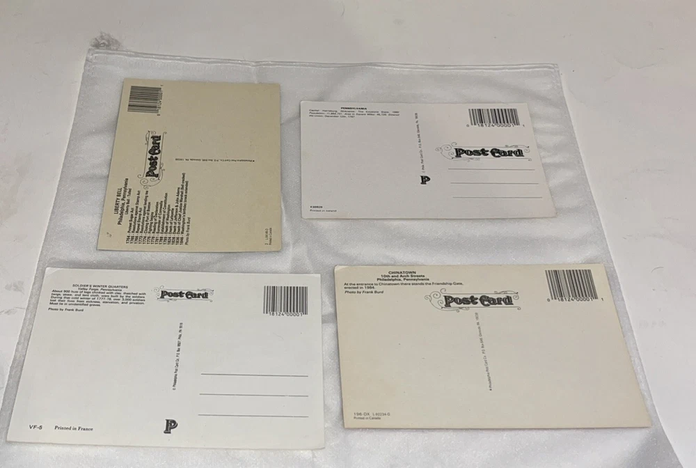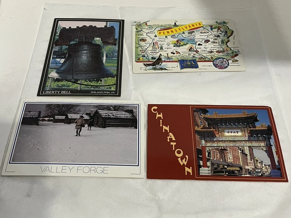Set Of 4 Vintage Pennsylvania Postcards Liberty Bell , Valley Forge, Map of Pennsylvania with Highlights about Pennsylvania and Chinatown. These are from the Philadelphia Post Card Co. Price is for the set of 4 cards.