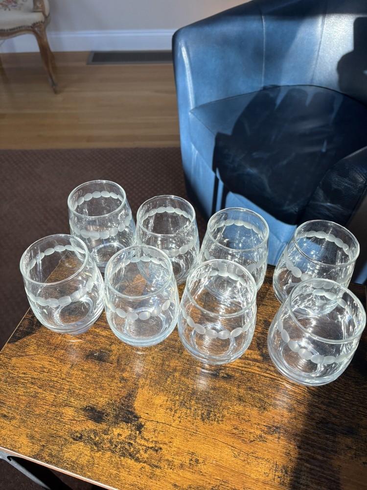 This set includes eight vintage Libbey rocks glasses in a retro mod style. Each glass measures 4 and 1/2 inches tall, weighs 8 oz, and features a clear color with a dot design. Made of glass in the United States, these rocks glasses offer a nostalgic touch to any barware collection.