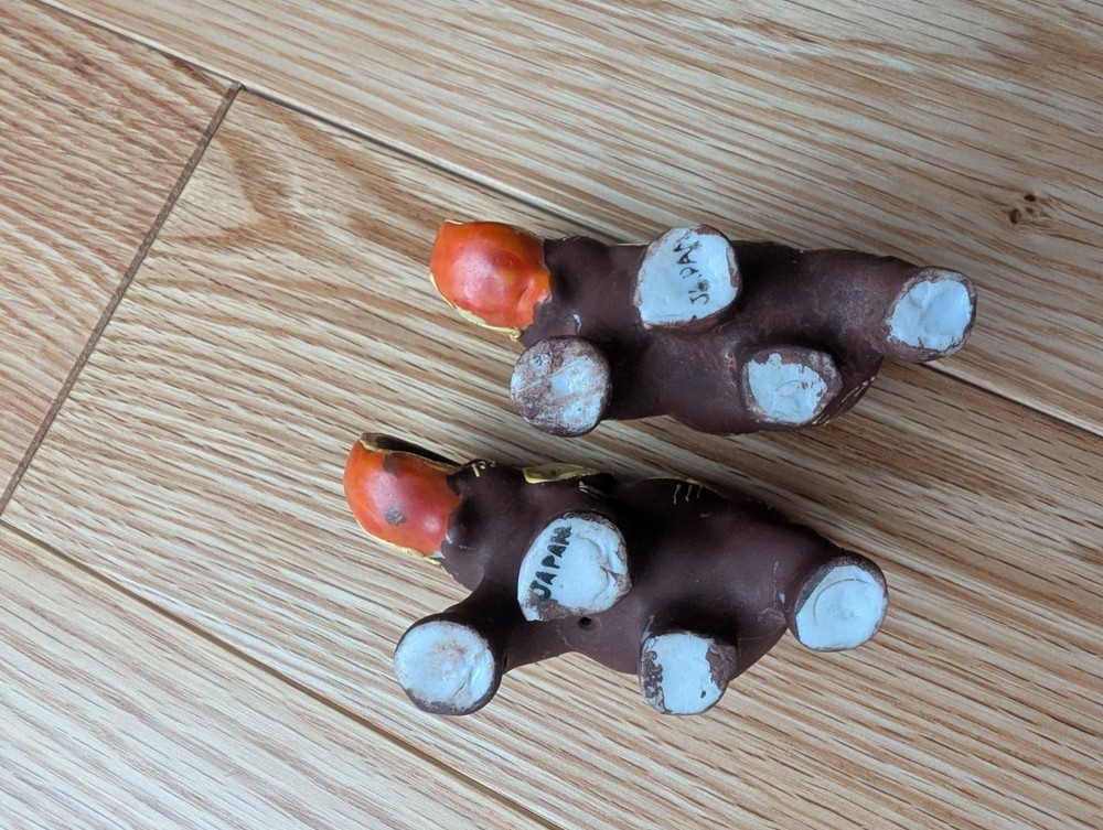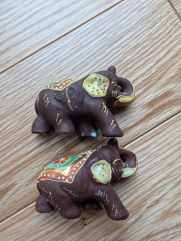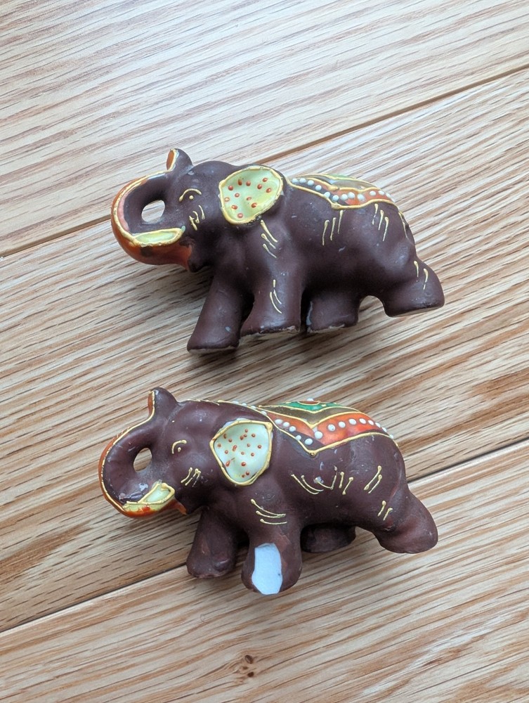 See images each Elephant has a chip in the porcelain. This vintage elephant figurine set from Japan is a charming addition to any collection. Made of brown porcelain, this piece depicts an Indian elephant with intricate detailing. Perfect for collectors interested in wildlife and unique figurines, this piece showcases craftsmanship and attention to detail. Made in Japan, this figurine adds a touch of elegance and nostalgia to any display.