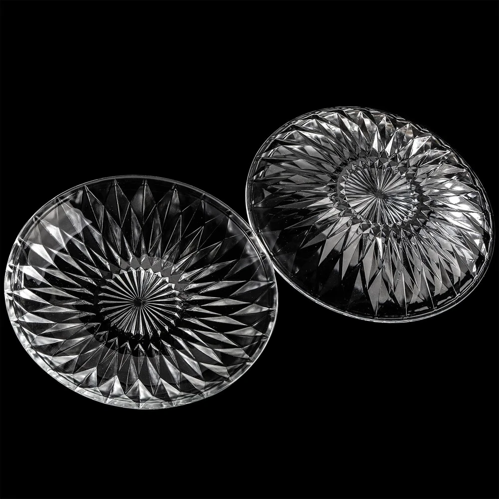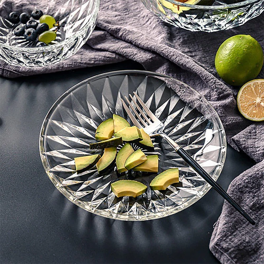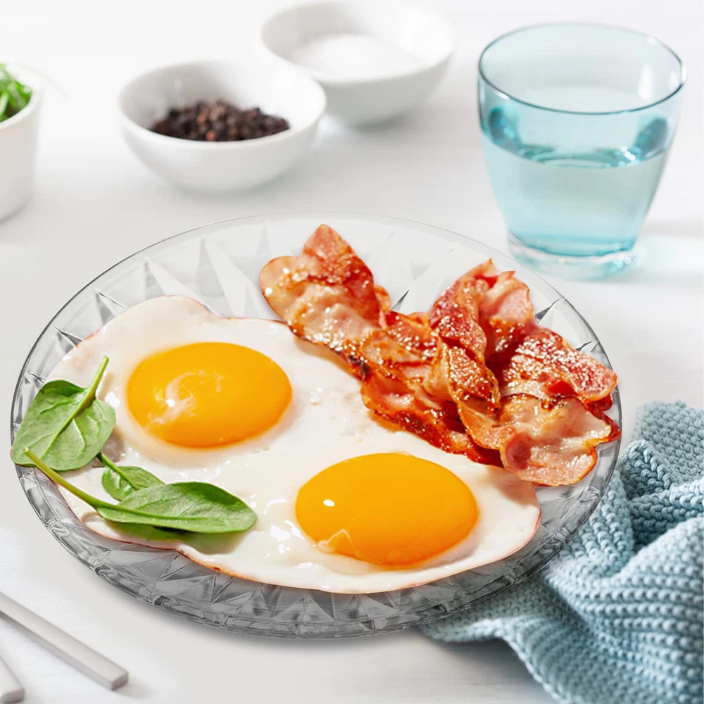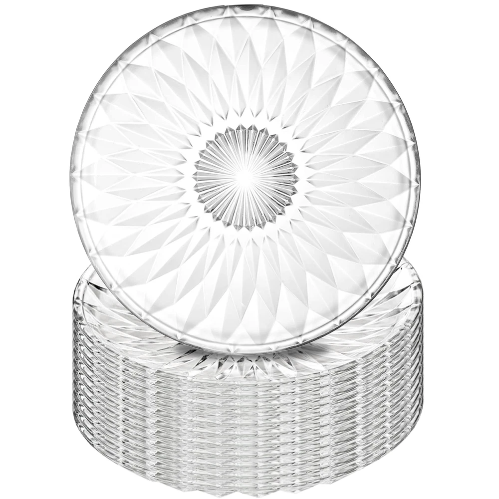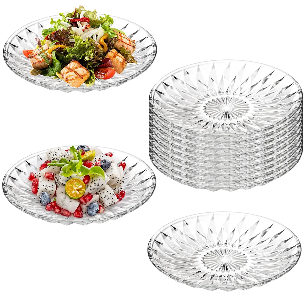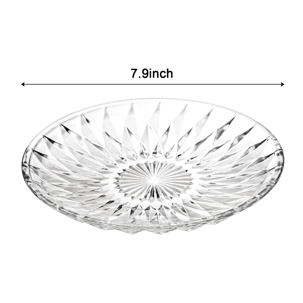 Hiceeden set of 12 clear glass salad plate, each plate measures 7.9"/20cm in diameter, ideal size for kinds of tables and easy to hold by your hands. Dessert plates made of high quality glass, thick, lead-free, healthy to use and easy to rinse. Highly clear glass plates with delicate pattern can serve as nice table or countertop decor. With a lip all around the edge to prevent food runaway, these glass food plates are also suitable to hold food with sauce, can used as daily breakfast, lunch or dinner dishes. Our crystal glass plates with practical design are practical to hold kinds of food such as pasta, salad, sandwiches, fruits, desserts, snacks, breads and more. These multipurpose dessert plate set of 12 with exquisite outlook, perfect for various occasions like weddings, parties, celebrations or festivals.